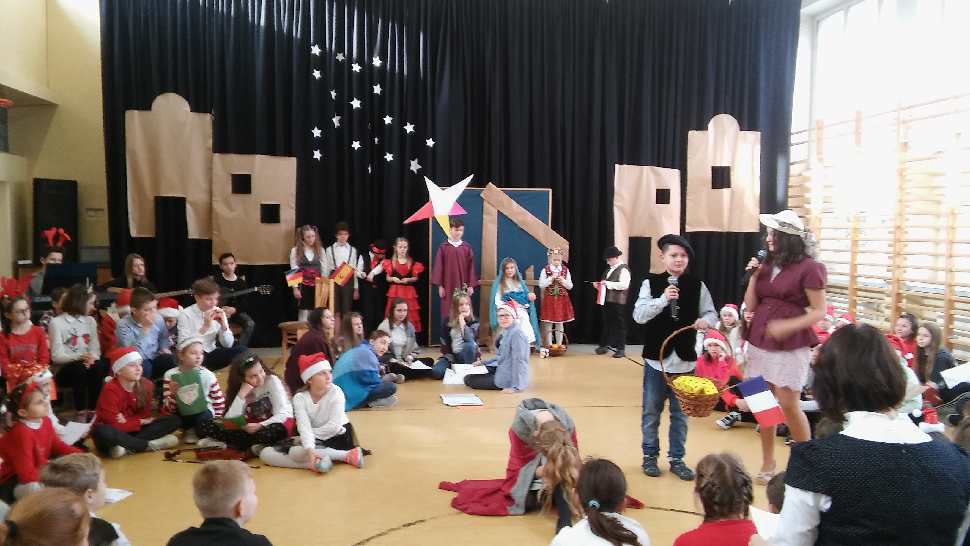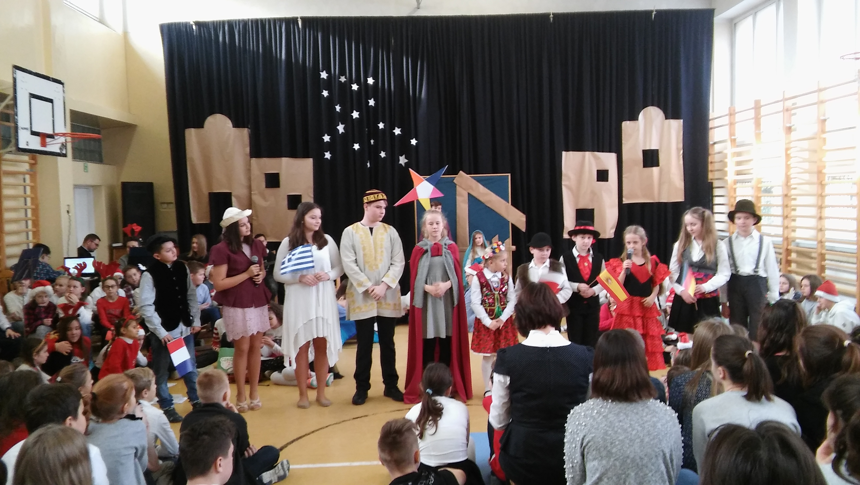 W piątek 21 grudnia 2018 r. w naszej szkole odbyło się przedstawienie jasełkowe. Przygotowali je chętni uczniowie z kl I,II,V,VI.VII,VIII pod opieką nauczycieli. Wcielili się oni w pielgrzymów zdążających do Nowonarodzonego Jezusa, przybyli oni z różnych krajów: Polski, Niemiec, Francji, Hiszpanii i Grecji niosąc Dzieciątku regionalne dary. Na swojej drodze spotykają Zwiastuna, który poddaje ich próbie, czy ich serca są gotowe ofiarować się Jezusowi. Całość została zwieńczona występem uczniów kl. VIII b, która przypomniała zebranym, skąd się wzięły świąteczne zwyczaje.