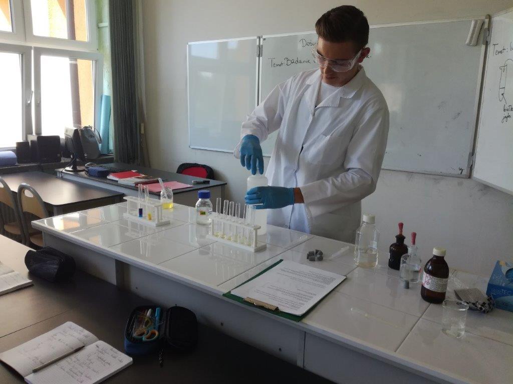 W dniu 4 czerwca 2019 w klasie 8a odbyła się nieco inna lekcja chemii. W rolę nauczyciela wcielił się Kacper Lizis, który zgłębiał temat właściwości białek. Prezentacja obfitowała w wiele doświadczeń, które mogły zostać wykonane dzięki naszej nowej pracowni chemicznej. Kacper zaprezentował jak na białka działają: temperatura, kwasy, zasady, alkohole oraz sole metali ciężkich i lekkich, a także pokazał dwa sposoby identyfikacji białek, tj. reakcję ksantoproteinową i biuretową. Lekcja była przeprowadzona wzorowo, zgodnie z wszelkimi zaleceniami sztuki nauczania, włącznie z zasadami BHP.