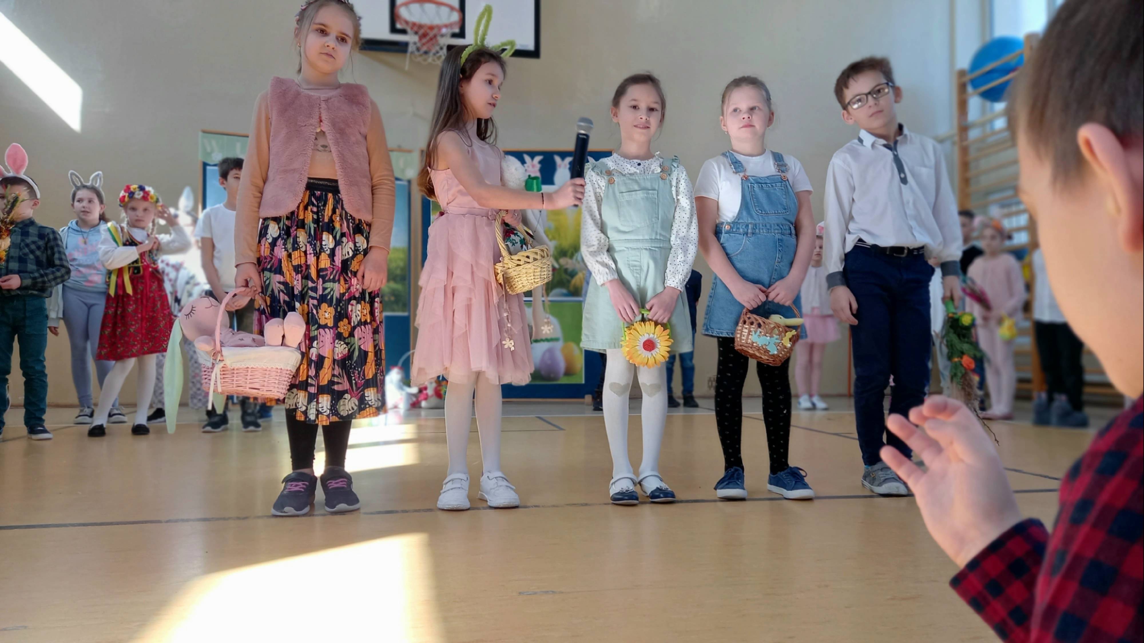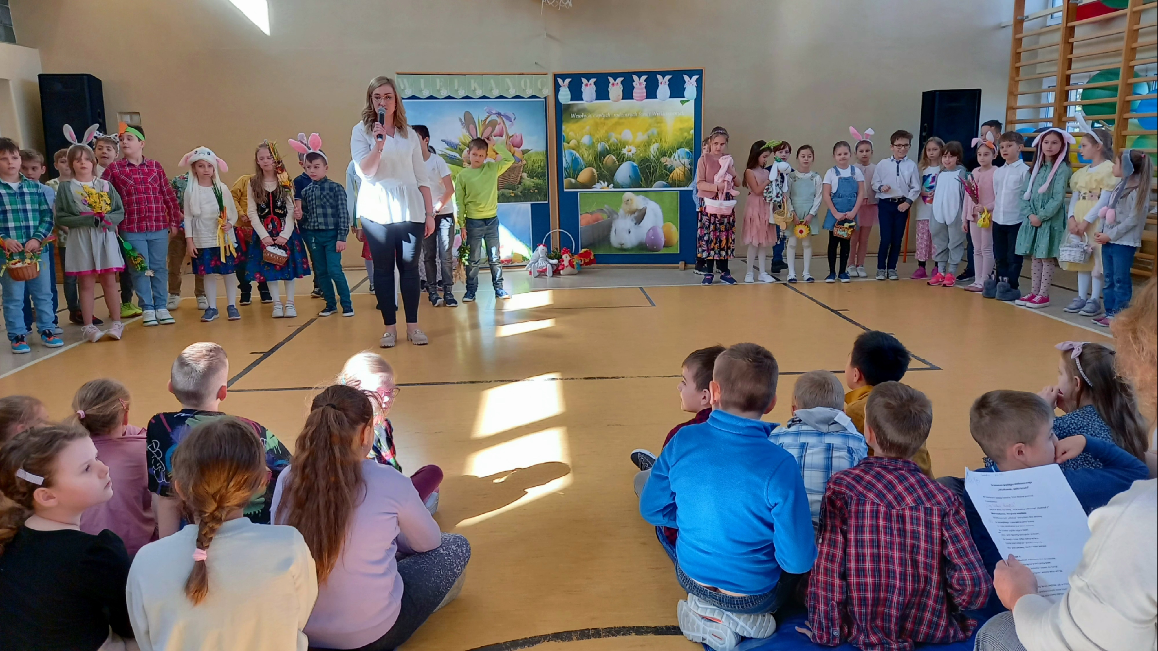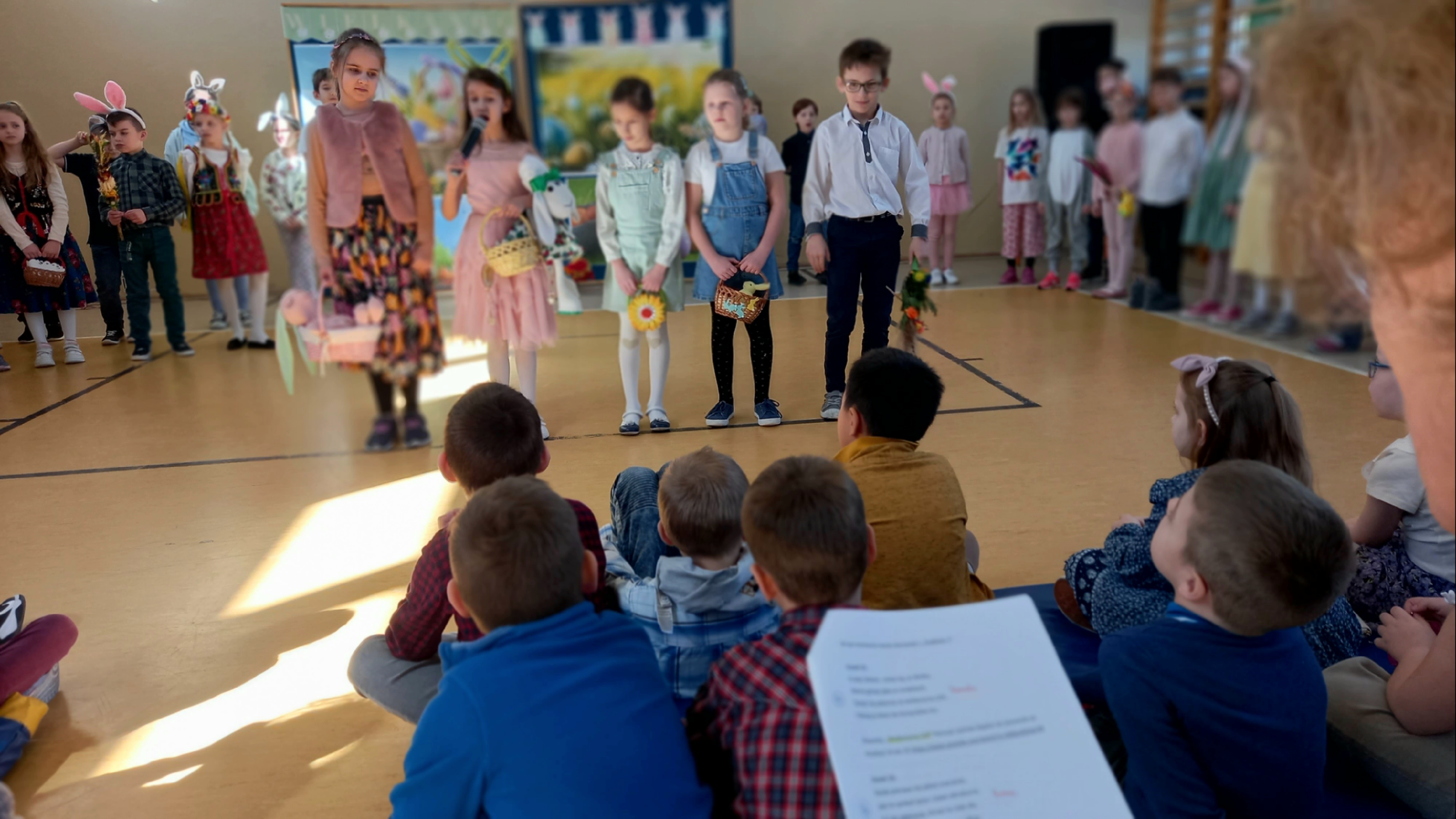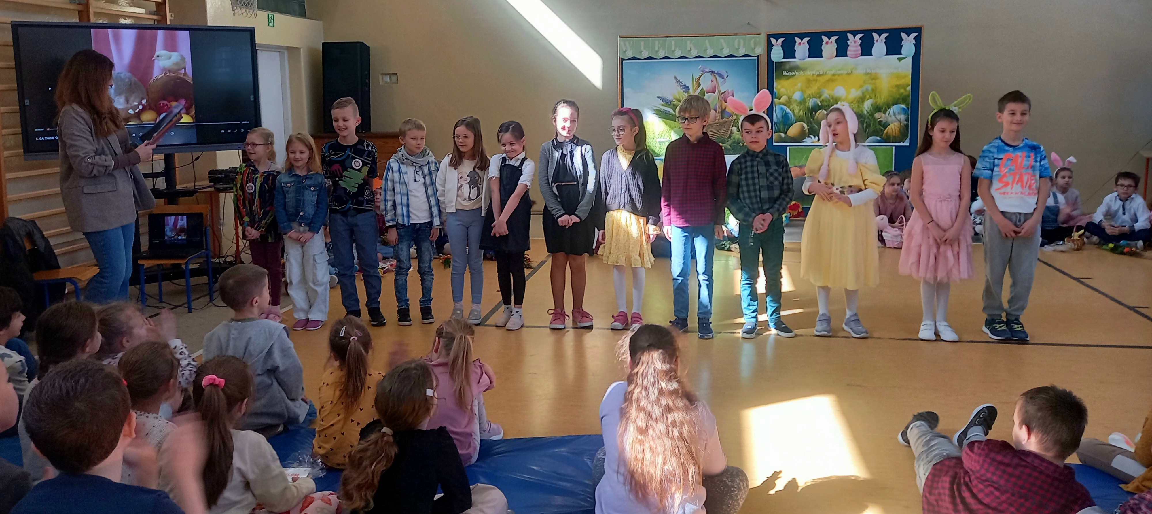 W dniu 26 marca, w naszej szkole, klasy drugie zaprezentowały się w krótkim przedstawieniu przygotowanym z okazji nadchodzących Świąt Wielkanocnych. Na scenie pojawiły się wesołe króliczki, rozkoszne baranki oraz urocze kurczątka. Dzieci były także przebrane w tradycyjne stroje krakowskie. Scenerię dopełniły takie rekwizyty jak koszyczki i palmy a na tablicy multimedialnejpojawiły się teledyski do śpiewanych piosenek. Sala gimnastyczna tętniła kolorami! Drugoklasiści przedstawili tradycje związane z Wielkanocą, począwszy od Niedzieli Palmowej po Lany Poniedziałek. Pięknie recytowane wiersze oraz wesoło odśpiewane piosenki wprowadziły nas w klimat zbliżających się Świąt.