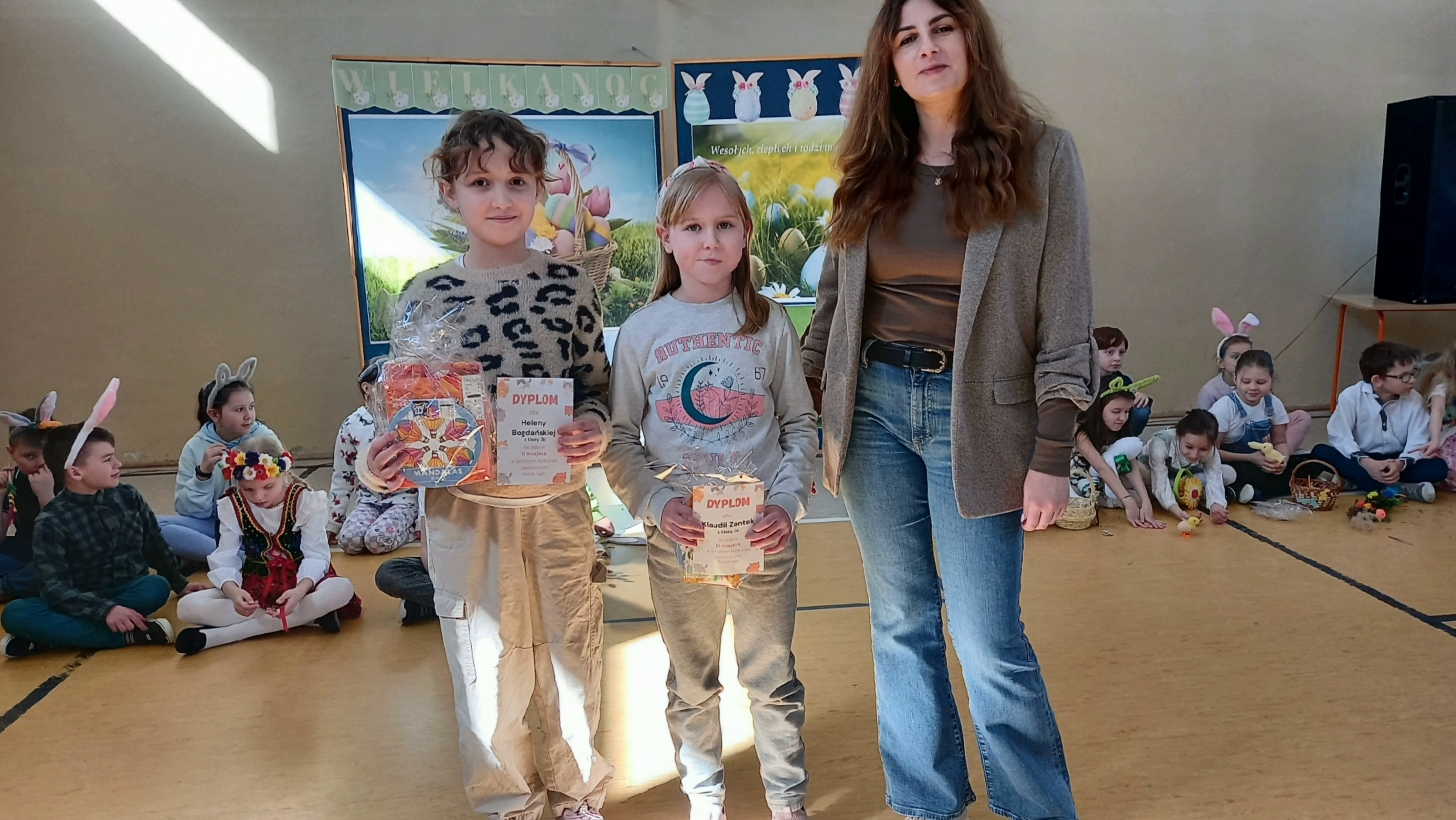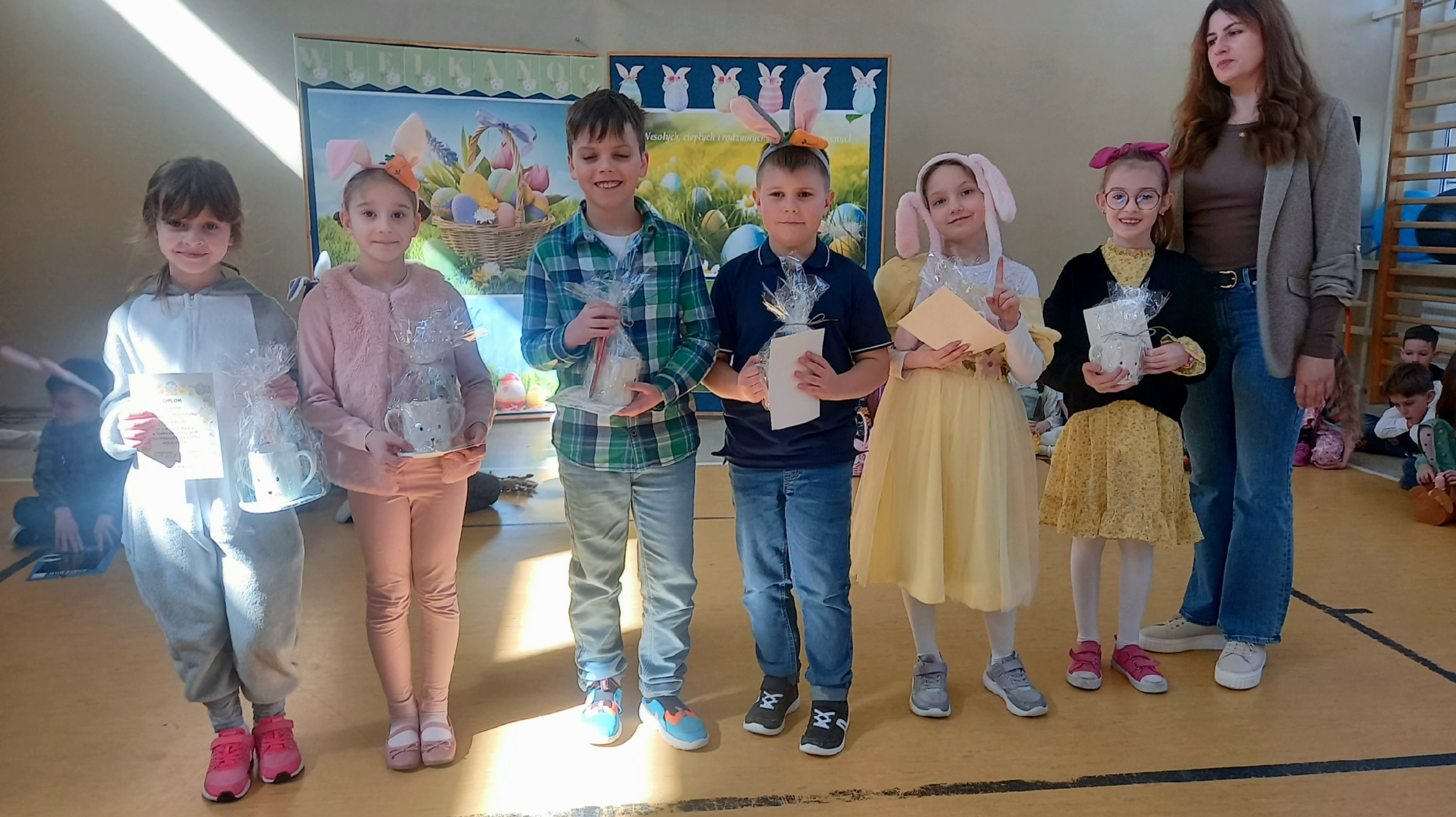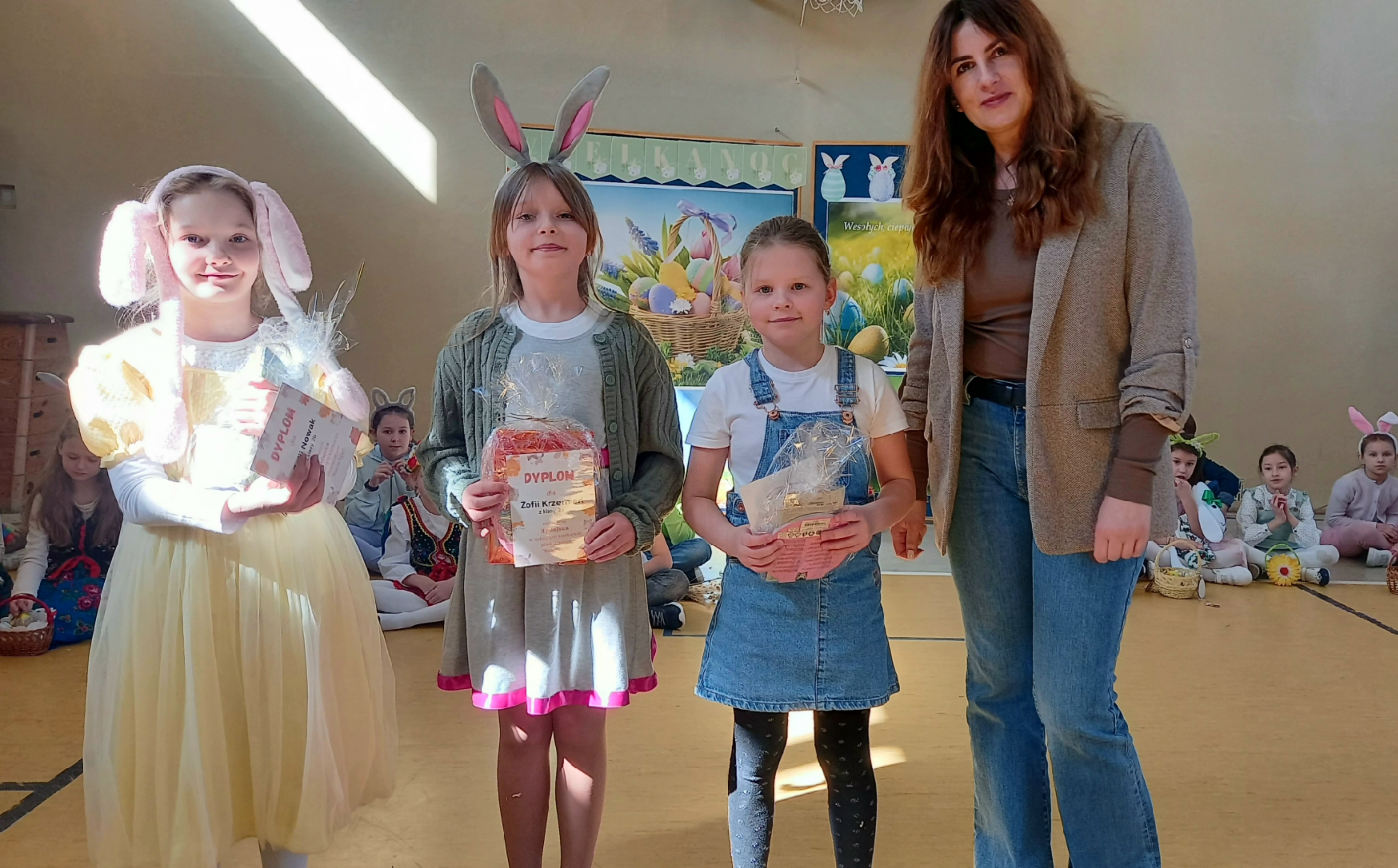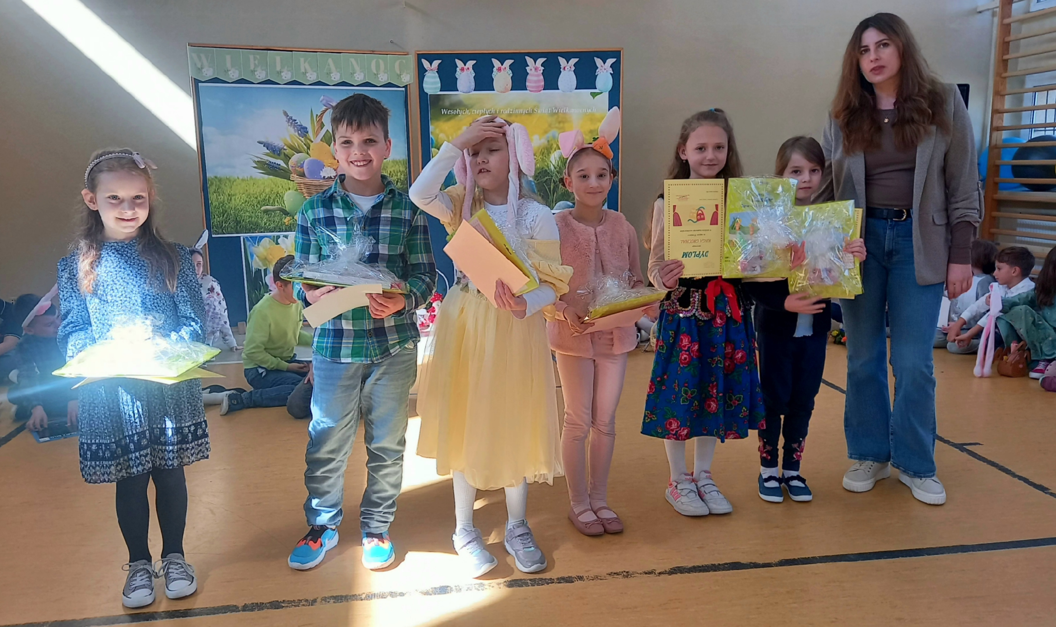 W dniu 26 marca, w naszej szkole, klasy drugie zaprezentowały się w krótkim przedstawieniu przygotowanym z okazji nadchodzących Świąt Wielkanocnych. Na scenie pojawiły się wesołe króliczki, rozkoszne baranki oraz urocze kurczątka. Dzieci były także przebrane w tradycyjne stroje krakowskie. Scenerię dopełniły takie rekwizyty jak koszyczki i palmy a na tablicy multimedialnejpojawiły się teledyski do śpiewanych piosenek. Sala gimnastyczna tętniła kolorami! Drugoklasiści przedstawili tradycje związane z Wielkanocą, począwszy od Niedzieli Palmowej po Lany Poniedziałek. Pięknie recytowane wiersze oraz wesoło odśpiewane piosenki wprowadziły nas w klimat zbliżających się Świąt.