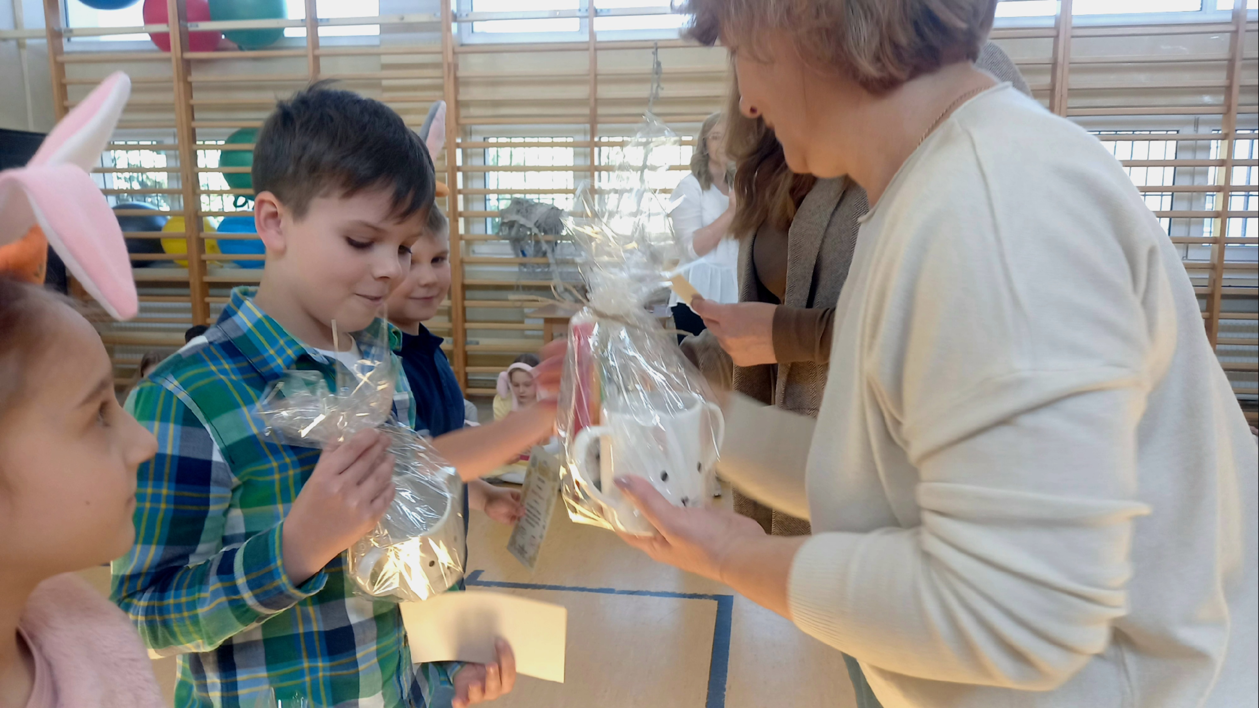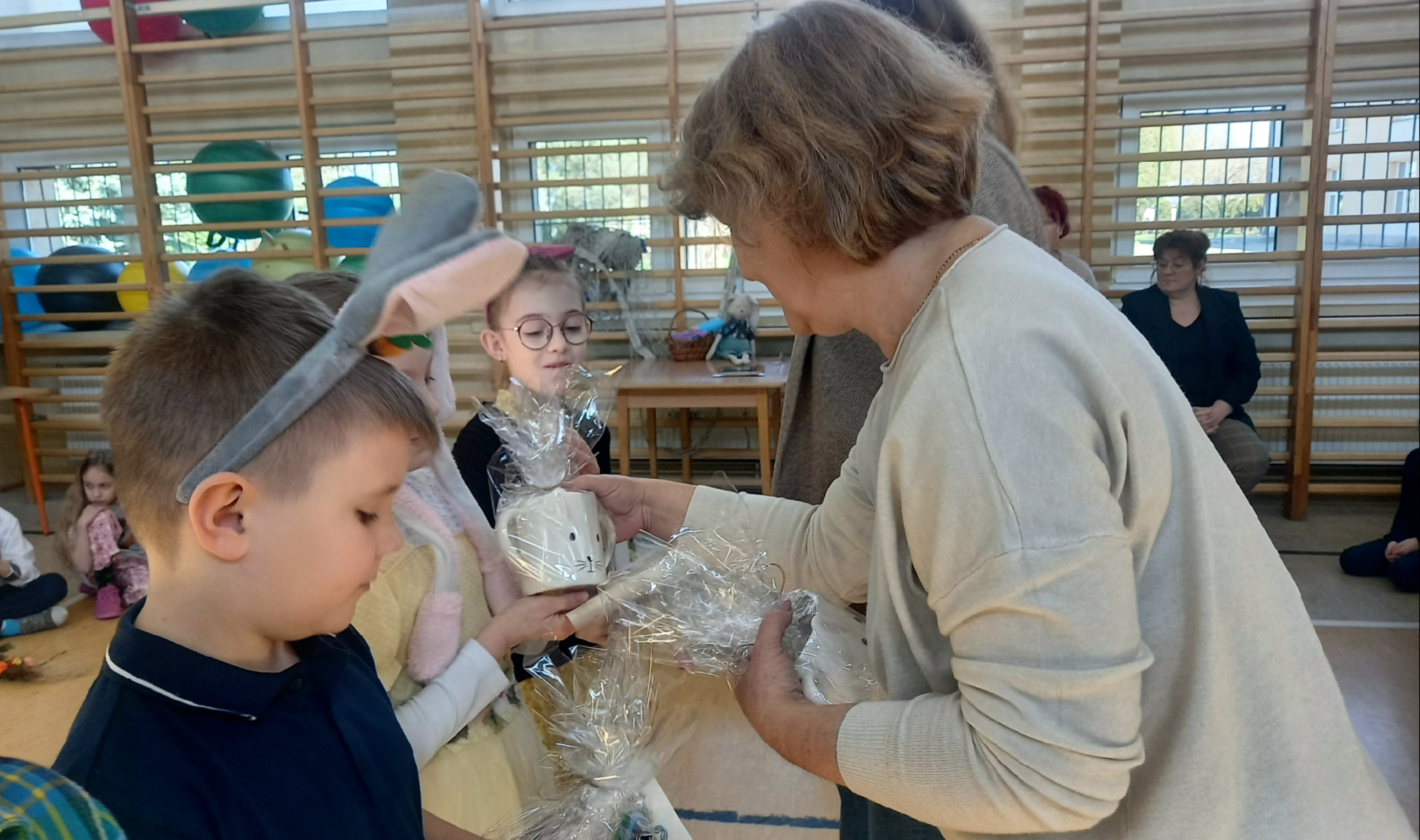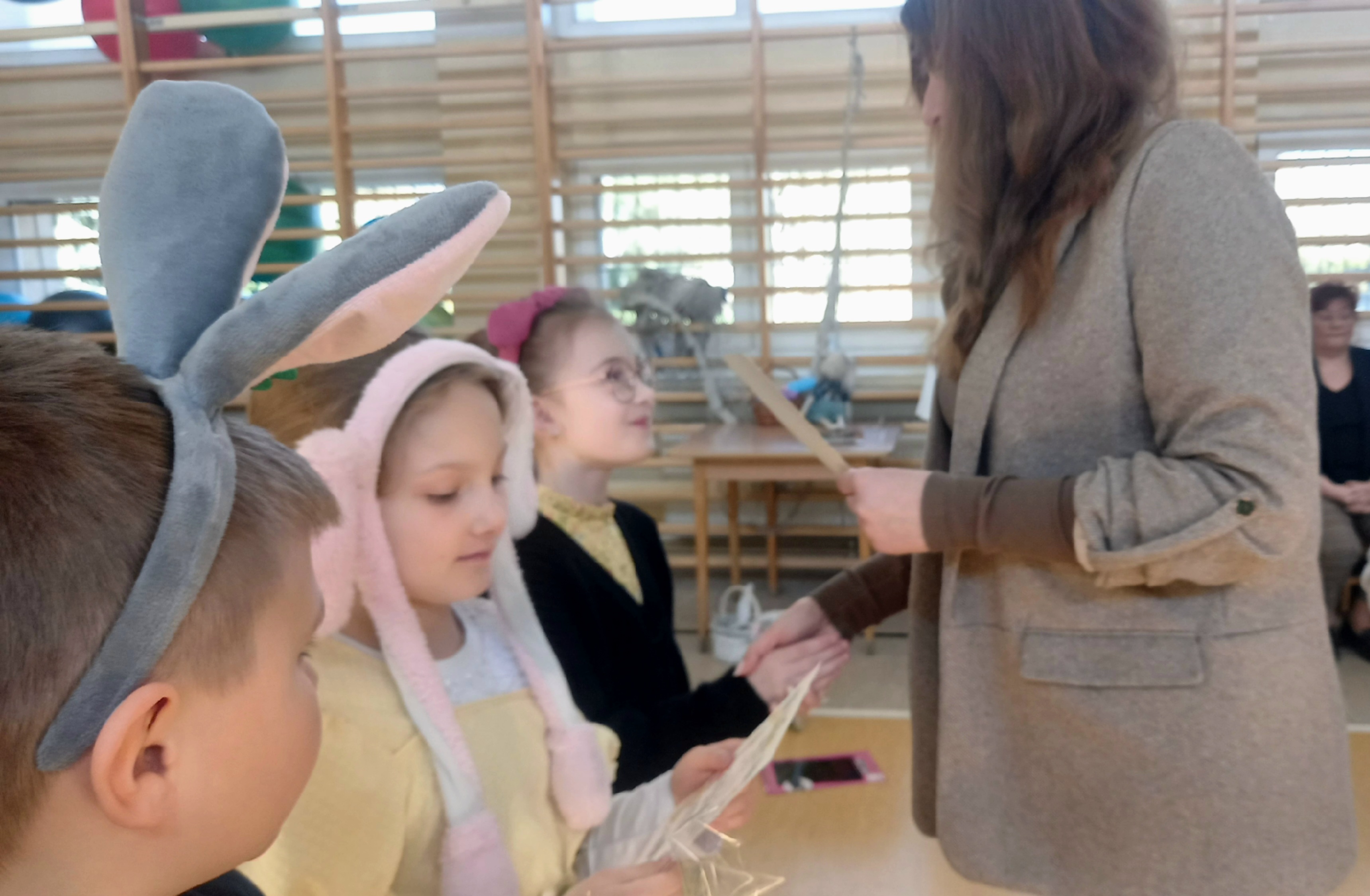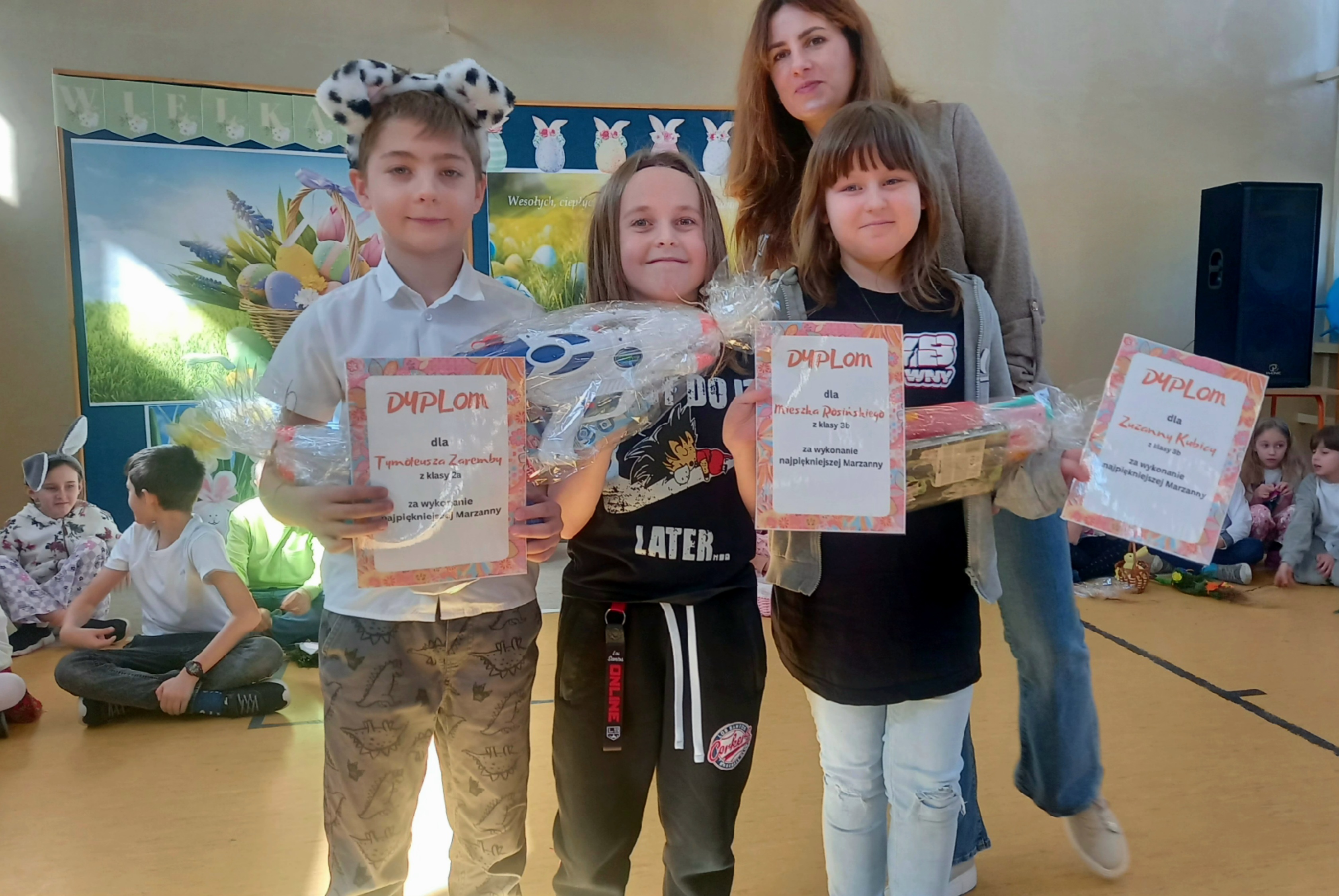 W dniu 26 marca, w naszej szkole, klasy drugie zaprezentowały się w krótkim przedstawieniu przygotowanym z okazji nadchodzących Świąt Wielkanocnych. Na scenie pojawiły się wesołe króliczki, rozkoszne baranki oraz urocze kurczątka. Dzieci były także przebrane w tradycyjne stroje krakowskie. Scenerię dopełniły takie rekwizyty jak koszyczki i palmy a na tablicy multimedialnejpojawiły się teledyski do śpiewanych piosenek. Sala gimnastyczna tętniła kolorami! Drugoklasiści przedstawili tradycje związane z Wielkanocą, począwszy od Niedzieli Palmowej po Lany Poniedziałek. Pięknie recytowane wiersze oraz wesoło odśpiewane piosenki wprowadziły nas w klimat zbliżających się Świąt.