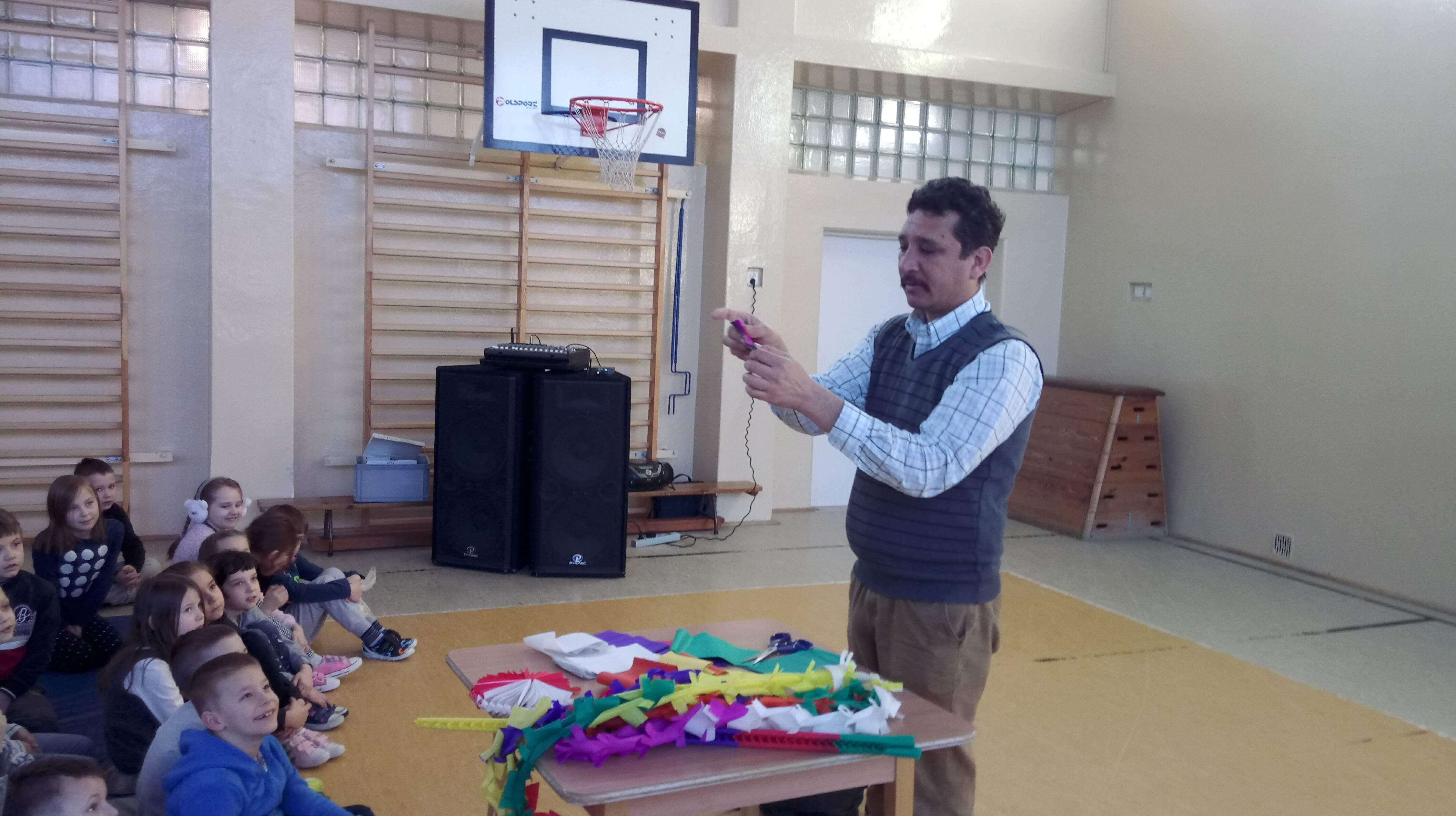 13 lutego najmłodsi uczniowie naszej szkoły mieli okazję spotkać się z ciekawym człowiekiem. Podczas występu gość z Indii zaprezentował swoje niezwykłe umiejętności tworzenia z papieru barwnych form przestrzennych. Dzięki zręczności palców i pomysłowości wyczarował dla nas fantastyczne kwiaty, girlandy, choinki, miecze i wszystko to, co można sobie wyobrazić patrząc na efekty jego pracy. Prezentacja wzbudziła zachwyt nie tylko młodszej widowni. Z pewnością mogła zachęcić do kreatywności i zainteresowania sztuką składania papieru.