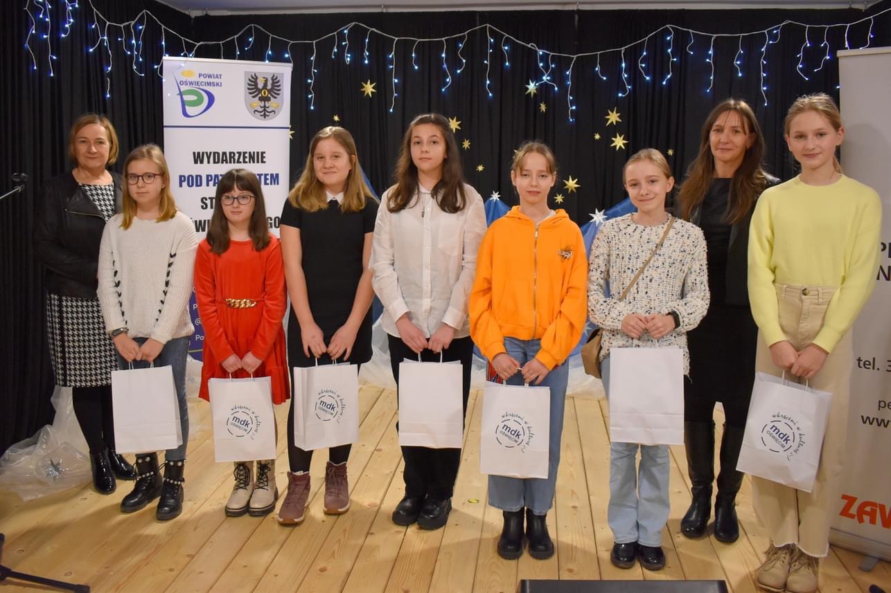 17 stycznia w Młodzieżowej Piwnicy Artystycznej odbyło się uroczyste wręczenie nagród powiatowego konkursu plastycznego “Kufer Wyobraźni” pod hasłem “Świąteczny Anioł” . Uczennica naszej szkoły Hanna Koczur z kl. 5b otrzymała nagrodę w swojej kategorii. Nagrody młodym artystom wręczyli Dyrektor MDK Alina Kwarciak oraz członkini Zarządu Powiatu Oświęcimskiego, pani Teresa Jankowska. Imprezę uświetnił występ laureatów III Powiatowego Konkursu Kolęd i Pastorałek. Honorowy patronat nad konkursem, na który wpłynęło ponad 400 prac z całego powiatu, objął Starosta Oświęcimski Andrzej Skrzypiński.