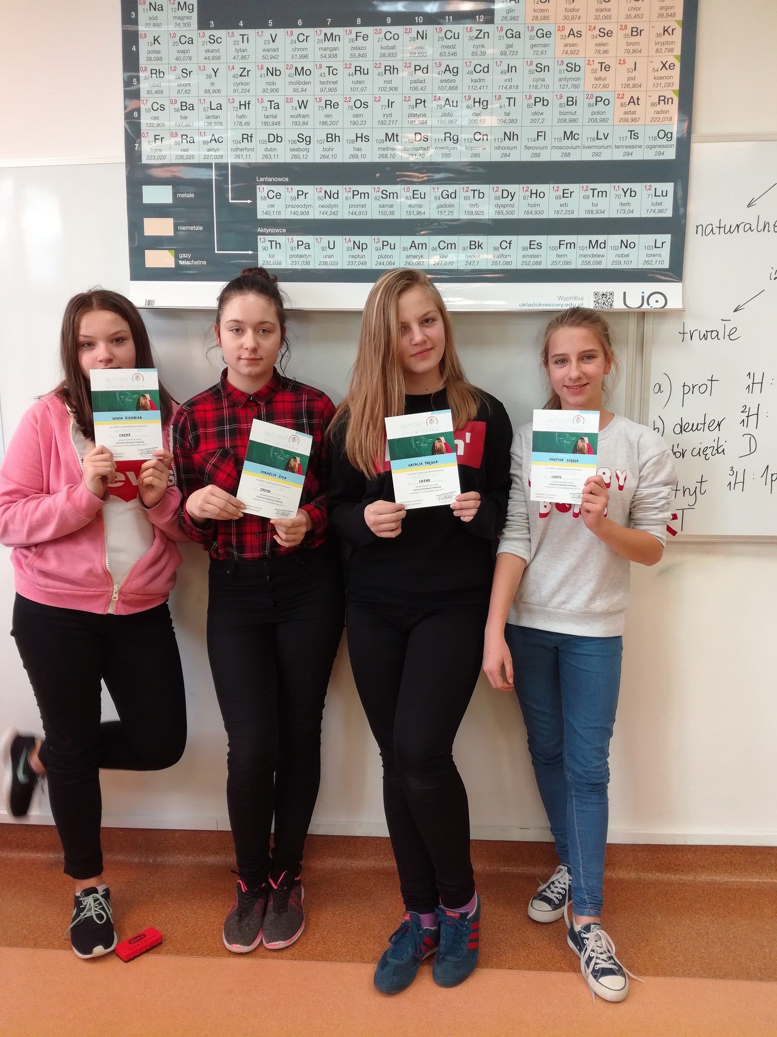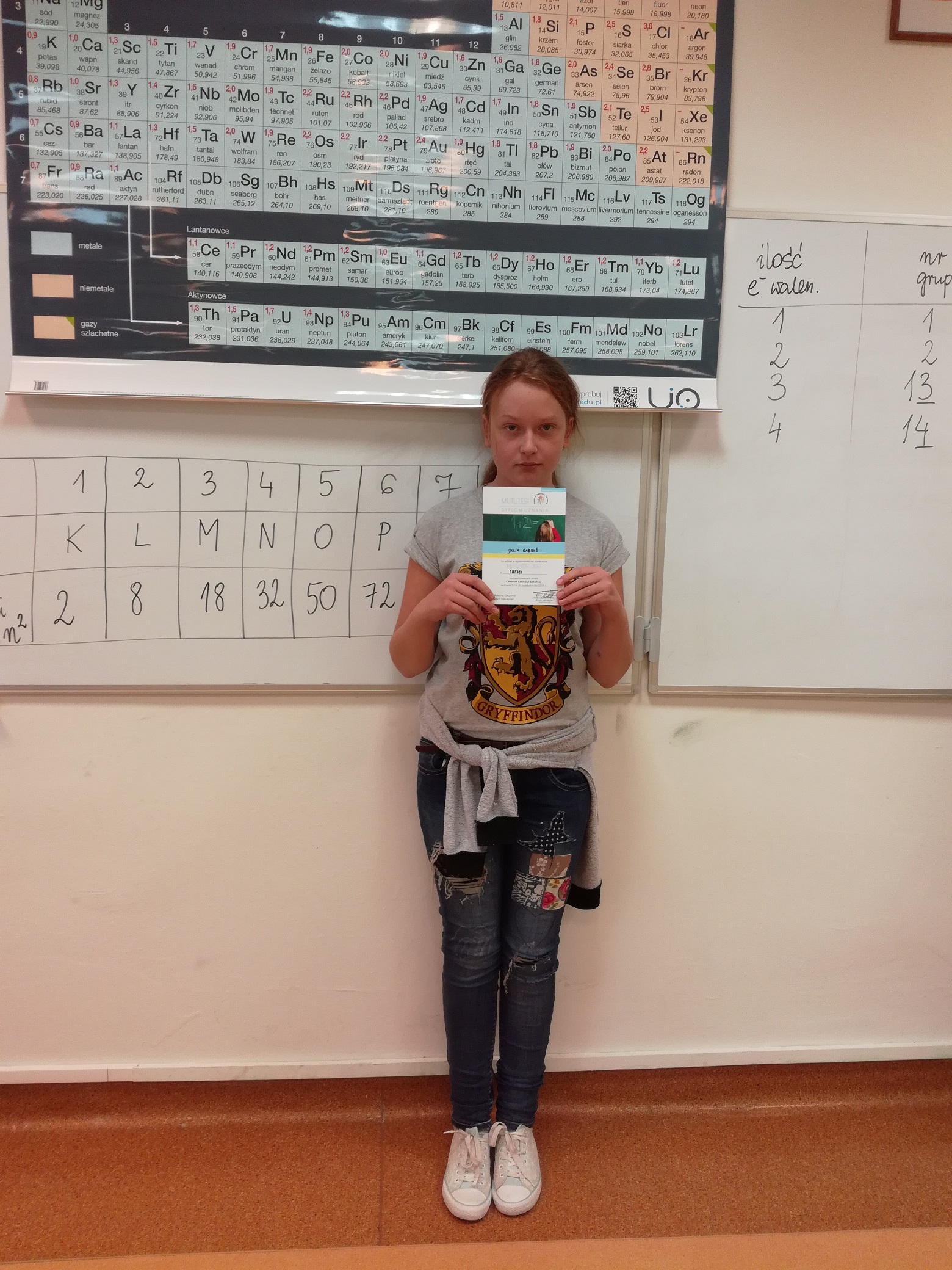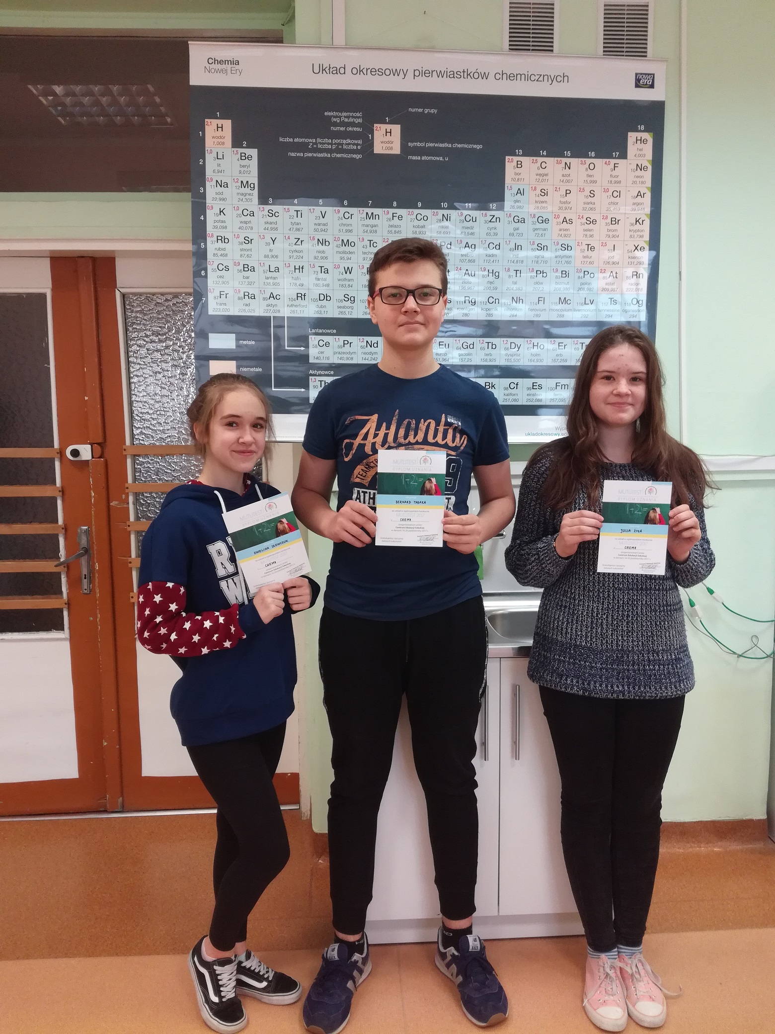 „Jesienią uczniowie klas siódmych wzięli udział w Ogólnopolskim Konkursie Chemicznym „Multitest”. Wielką niespodzianką okazał się tytuł laureata zdobyty przez Kacpra Sikorę z klasy 7d. Jest to ogromny sukces, biorąc pod uwagę, że uczniowie przystępując do konkursu mieli za sobą zaledwie dwa miesiące nauki nowego przedmiotu. Tym bardziej gratulujemy Kacprowi oraz wszystkim pozostałym uczestnikom.”