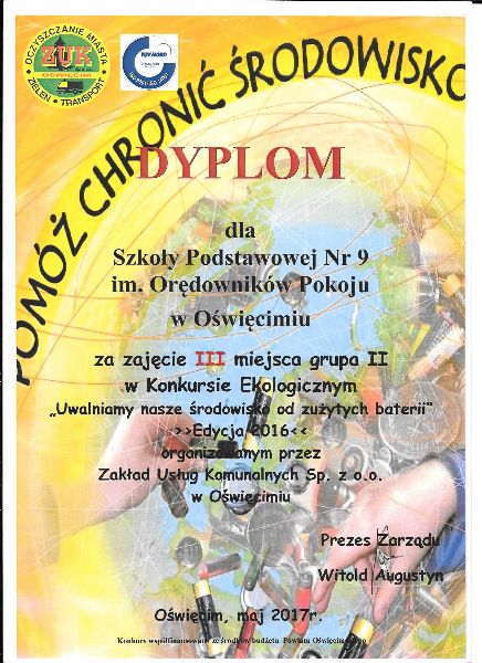 W dniu 8 maja 2017 w OCK odbyło się podsumowanie konkursu ekologicznego „Uwalniamy nasze środowisko od zużytych baterii” - Edycja 2016. W organizowanym przez Zakład Usług Komunalnych w Oświęcimiu działaniu nasza szkoła zajęła 3 miejsce. Uzyskaliśmy ten wynik dzięki zebraniu przez uczniów 500 kg zużytych baterii. W nagrodę nasza szkoła otrzymała kolejny element rowerowego toru przeszkód – pochylnię. Już dzisiaj zachęcamy uczniów do aktywnego udziału w kolejnych edycjach tego wartościowego przedsięwzięcia.