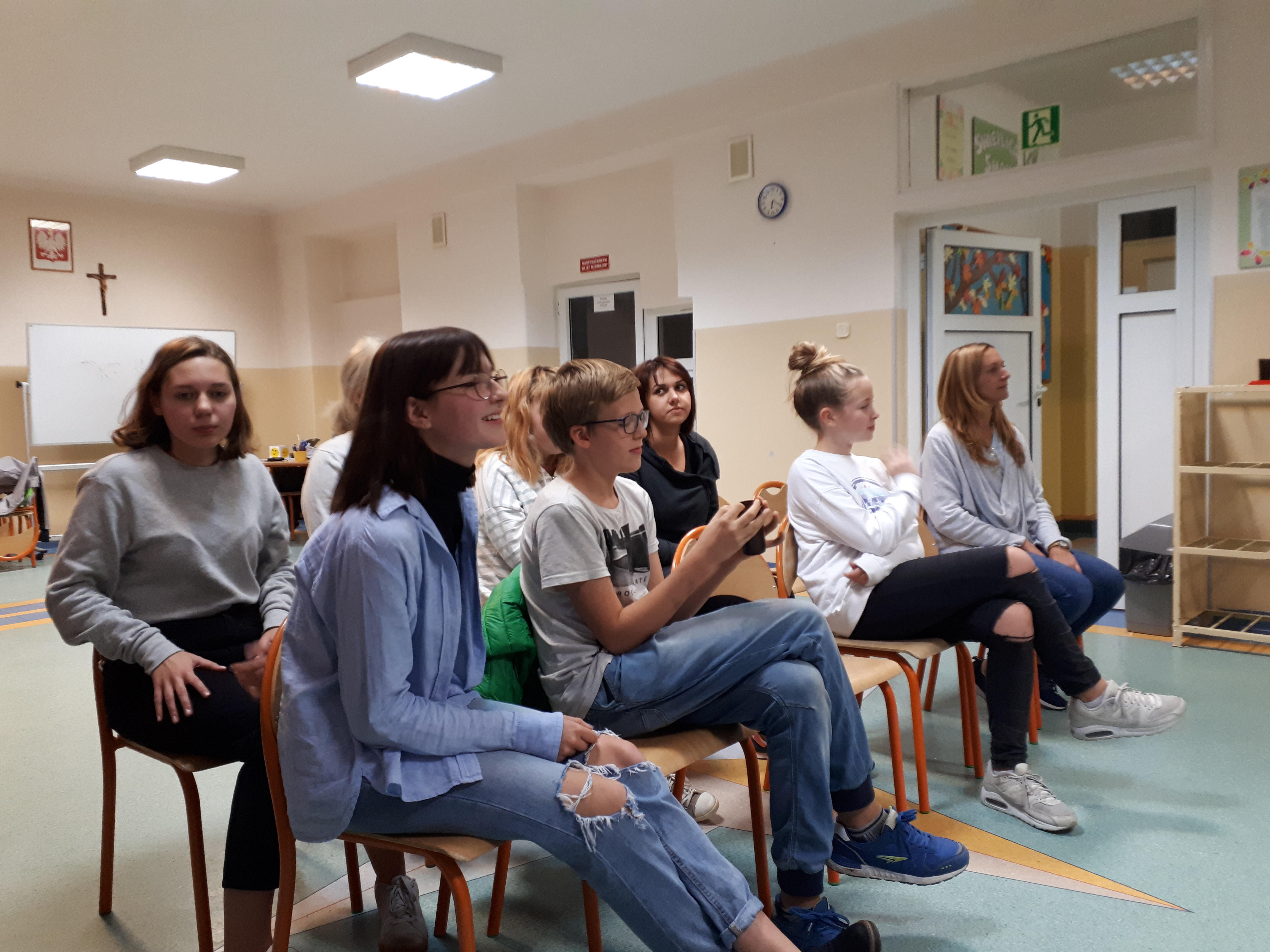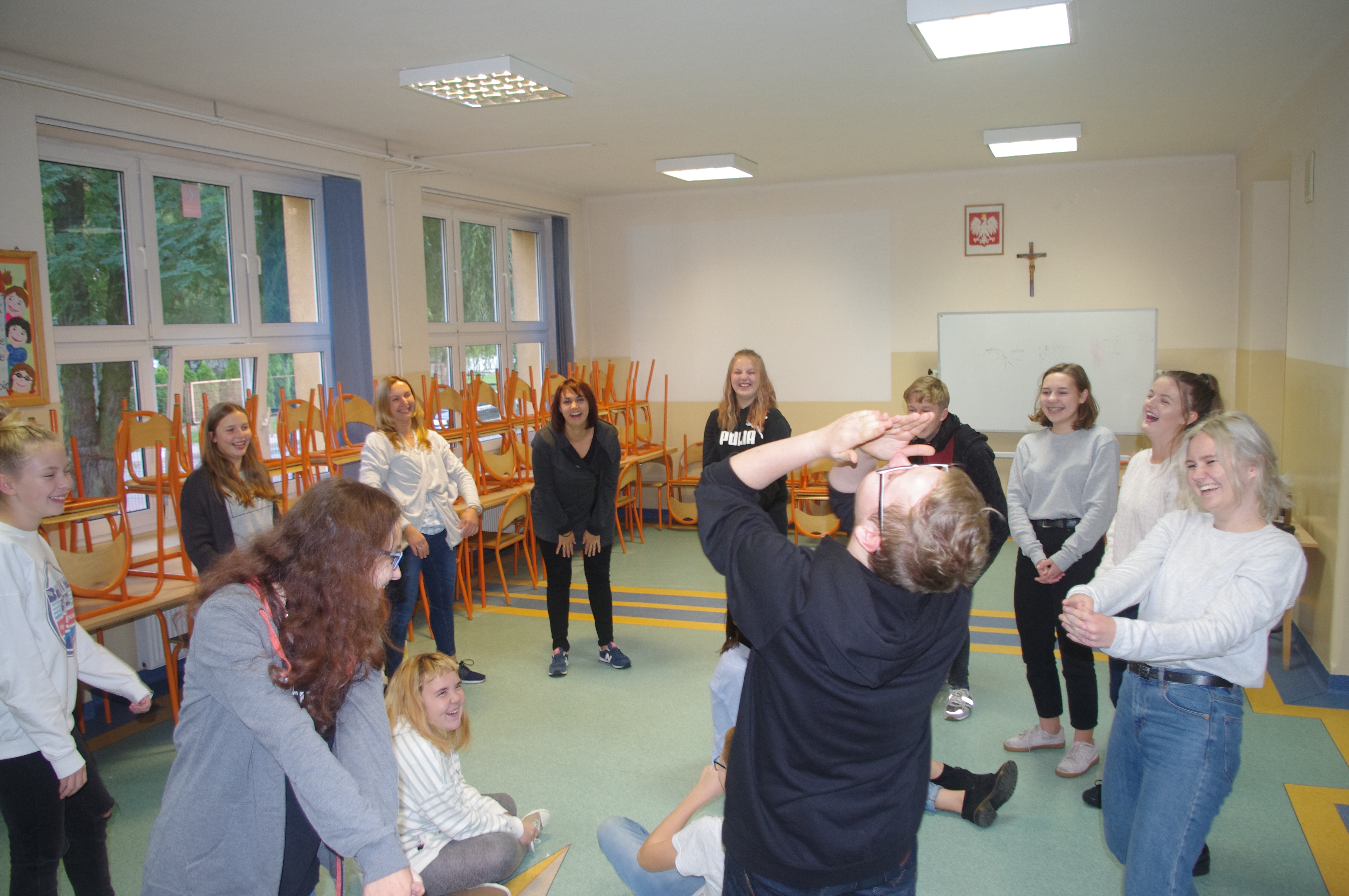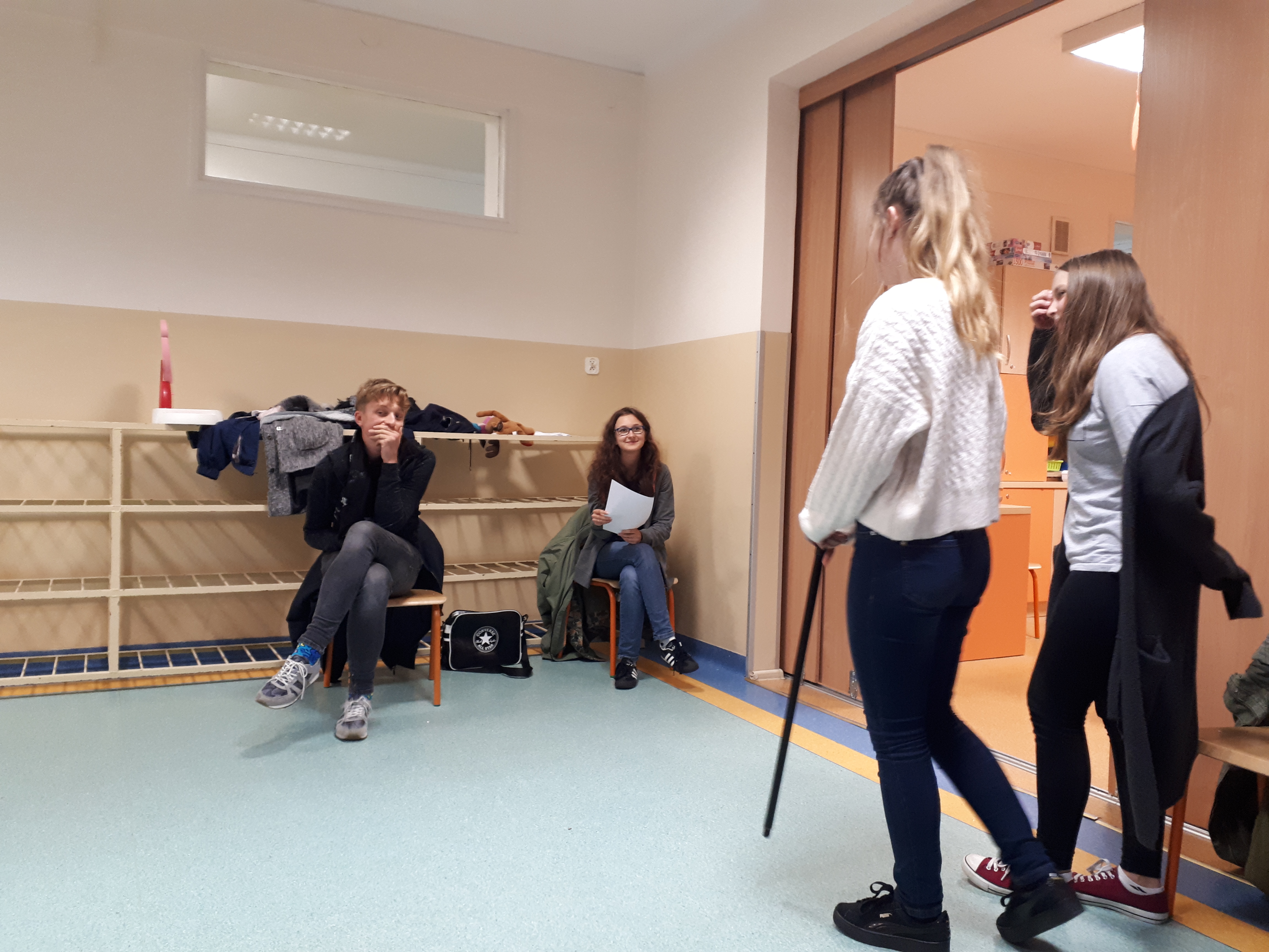 4 października uczestnicy projektu „Odczarowany Oświęcim” spotkali się po raz kolejny. Tym razem miejscem zajęć była Szkoła Podstawowa nr 9 w Oświęcimiu, celem przełamanie bariery strachu przed publicznymi występami, a metodą warsztaty teatralne.