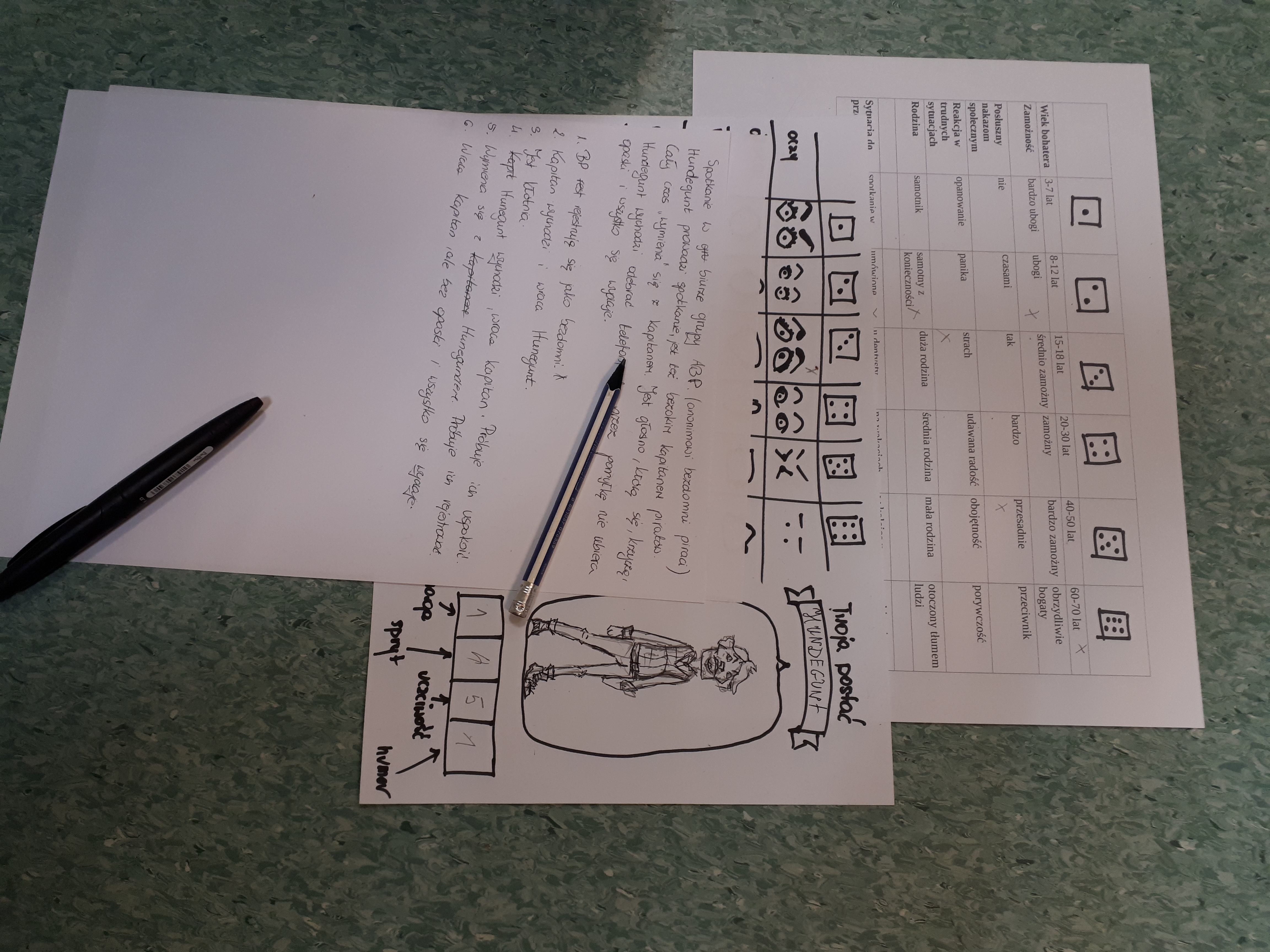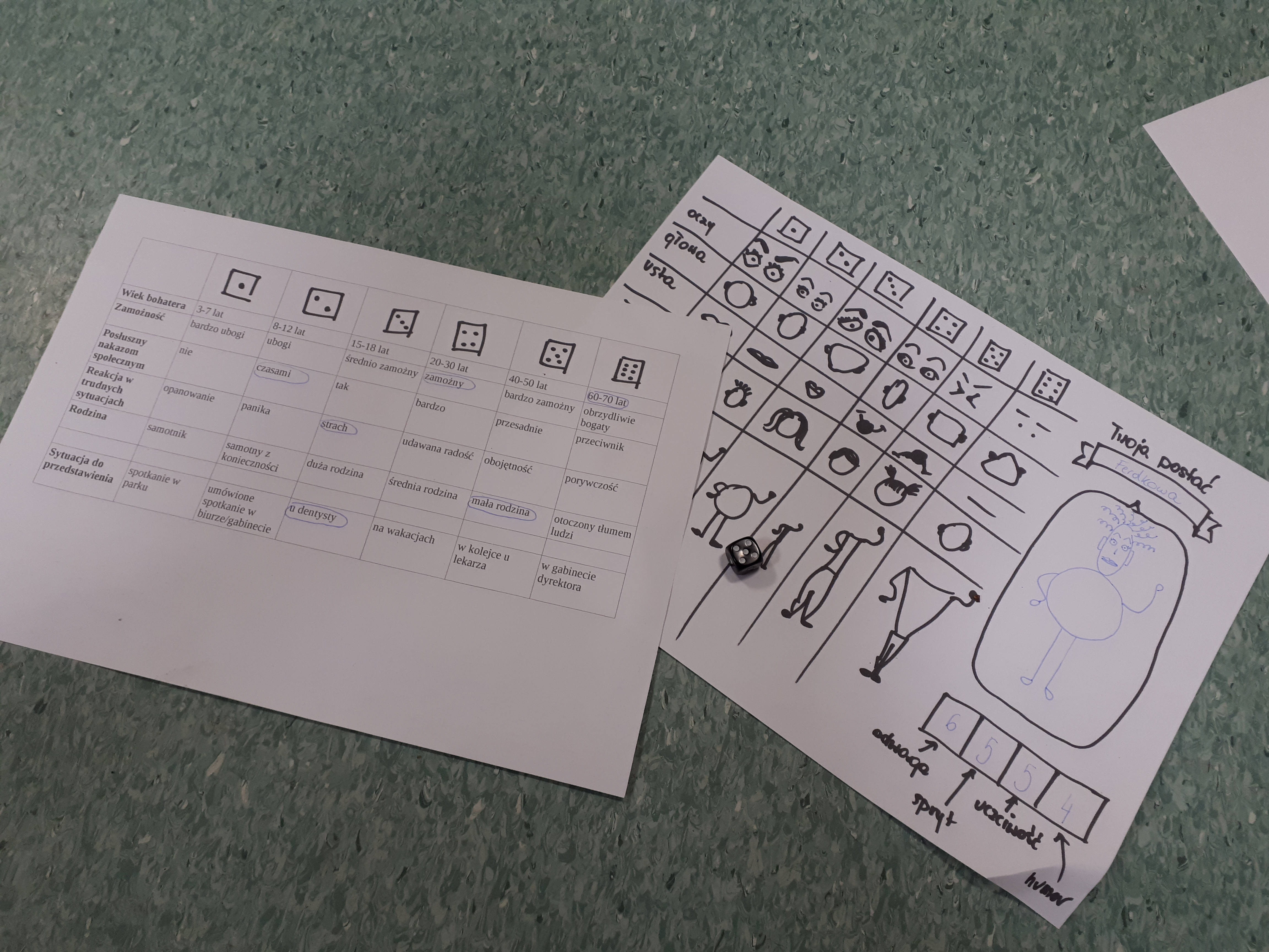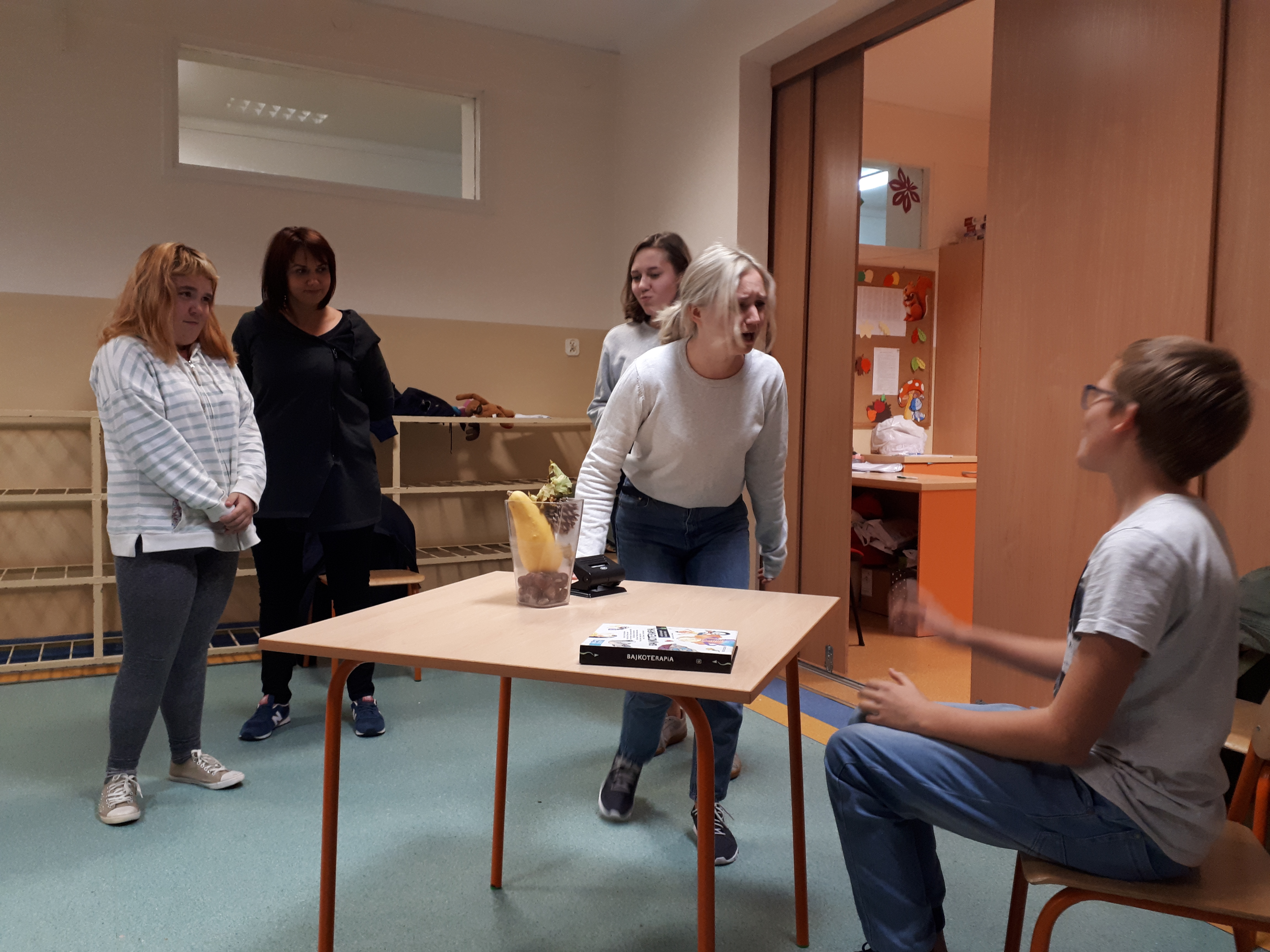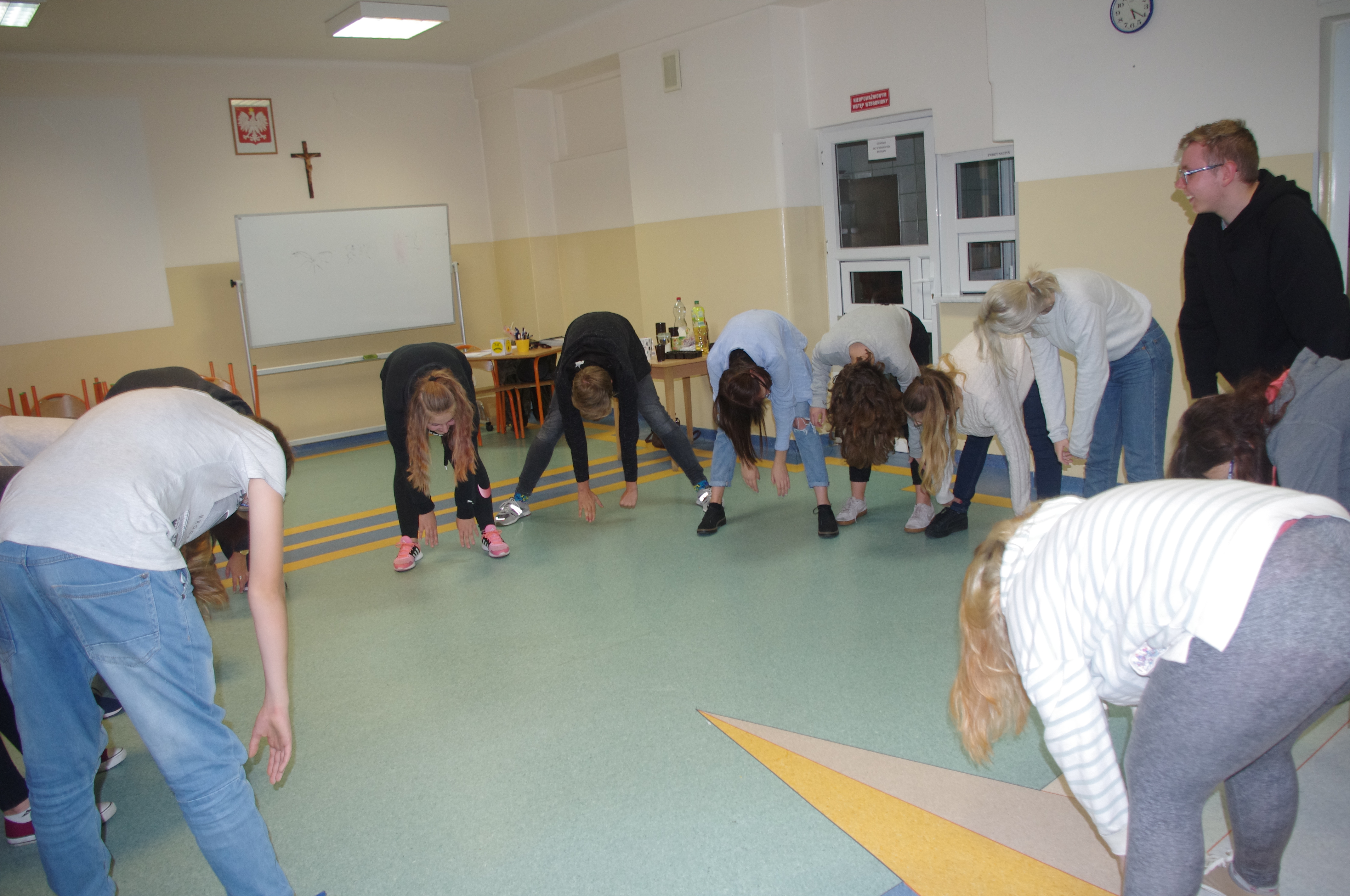 Standartowym naszym działaniem była integracja przez zabawę ułatwiającą coraz bliższe poznanie się uczestników. Następnie szeregiem ćwiczeń rozluźniliśmy swoje ciała i narząd mowy. Po wprawkach dykcyjnych przyszedł czas na krótkie etiudy teatralne. Ćwiczenia aktorskie były wprowadzeniem do przygotowania scenek teatralnych. Już w mniejszych grupach „wyturlaliśmy” sobie bohatera – jego wygląd i cechy charakteru, a następnie opracowaliśmy scenariusz przedstawienia. Punktem kulminacyjnym było przedstawienie scenek. Odkryliśmy w sobie ukryte pokłady ekspresji, odwagi i kunsztu aktorskiego. Radości i brawom nie było końca. Warsztaty zakończyły ćwiczenia relaksacyjne, które wprowadziły nas w stan odprężenia po ciężkiej pracy.