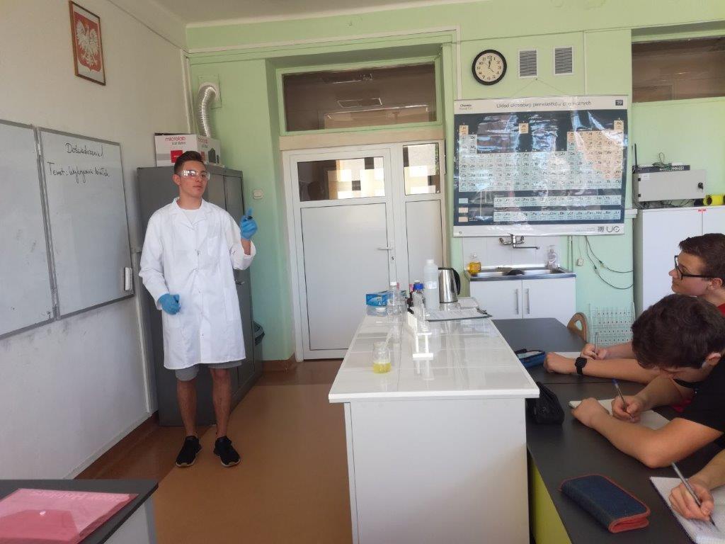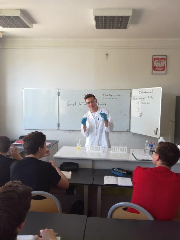 W dniu 4 czerwca 2019 w klasie 8a odbyła się nieco inna lekcja chemii. W rolę nauczyciela wcielił się Kacper Lizis, który zgłębiał temat właściwości białek. Prezentacja obfitowała w wiele doświadczeń, które mogły zostać wykonane dzięki naszej nowej pracowni chemicznej. Kacper zaprezentował jak na białka działają: temperatura, kwasy, zasady, alkohole oraz sole metali ciężkich i lekkich, a także pokazał dwa sposoby identyfikacji białek, tj. reakcję ksantoproteinową i biuretową. Lekcja była przeprowadzona wzorowo, zgodnie z wszelkimi zaleceniami sztuki nauczania, włącznie z zasadami BHP.