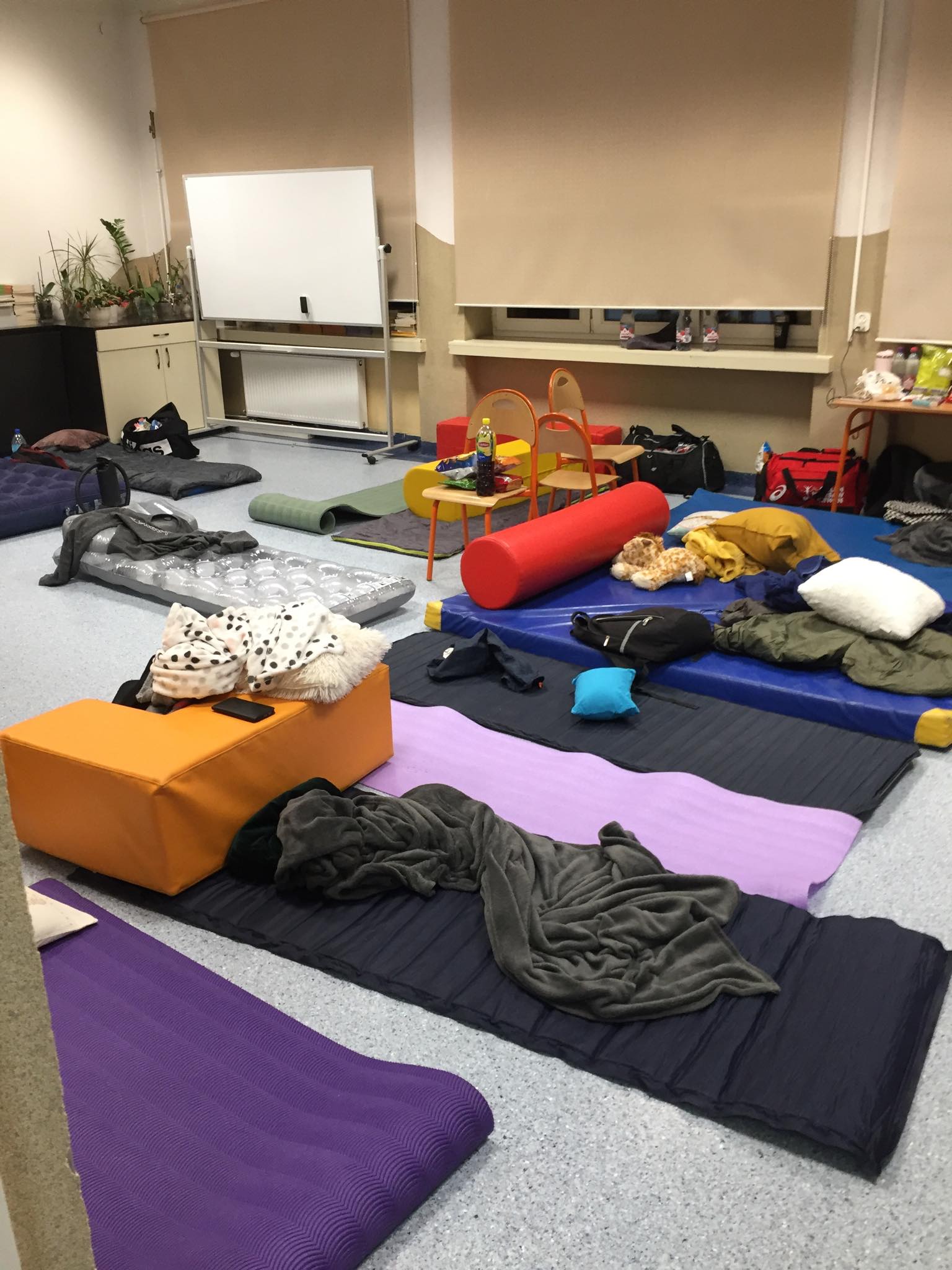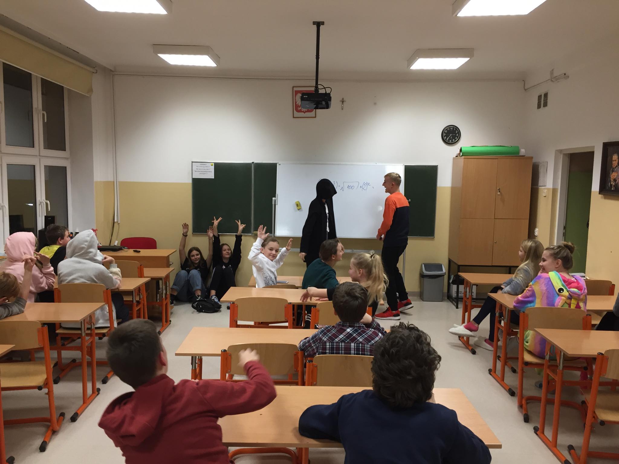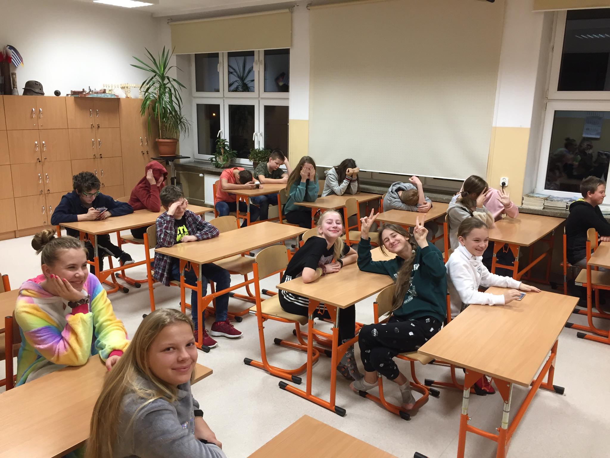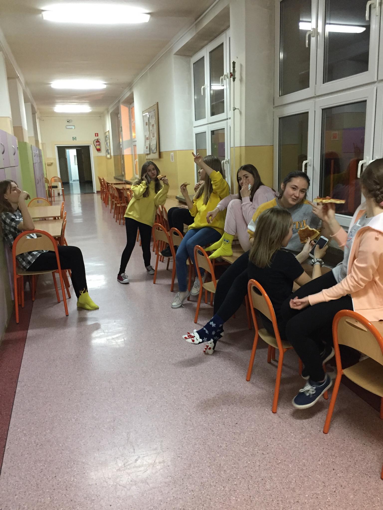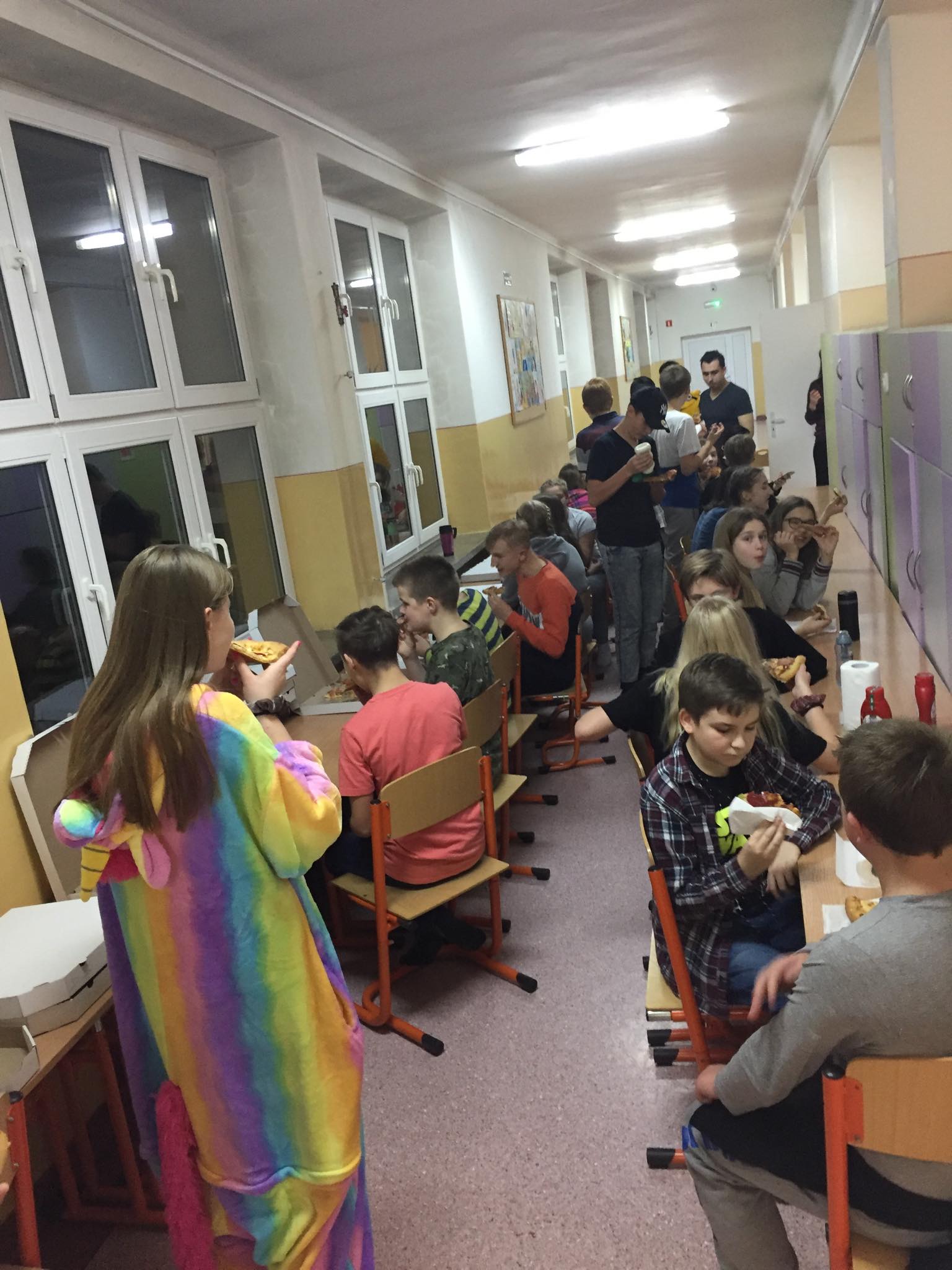 Noc z piątku na sobotę – 13/14 grudnia - chętni uczniowie klas 7 i 8 spędzili w szkole. Spotkanie zaczęło się – nie mogło być inaczej– od pizzy. Następnie było wspólne wspólne rozmowy, zabawy, zakończone losowaniem biletów do kina. Nie obyło się bez wysiłku fizycznego, czyli sprzątania sal oraz intelektualnego – znaleźli się chętni do rozwiązywania zadań z matematyki. Może będzie następny raz ...