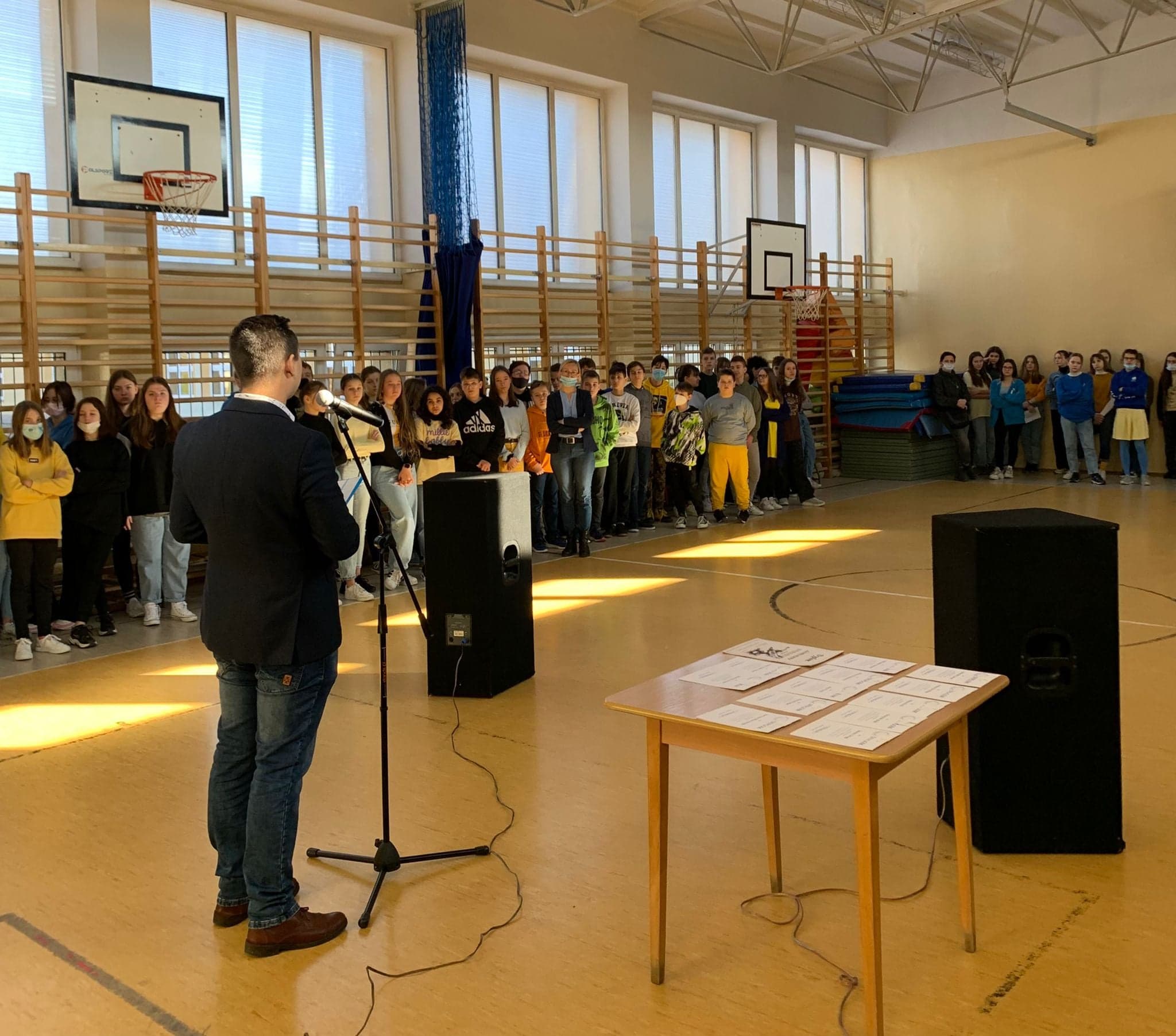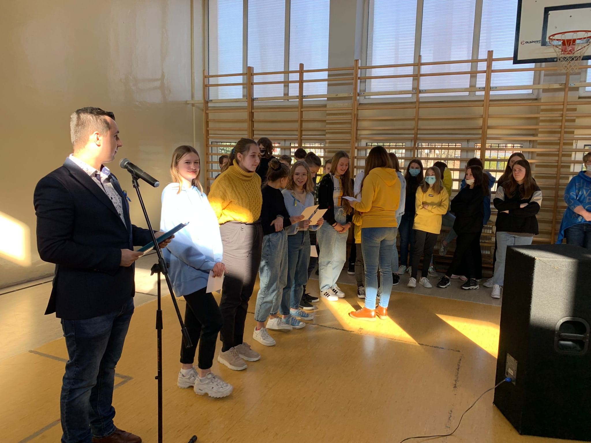 W dniu 1 marca 2022r. odbył się w naszej szkole apel. Upamiętniony został „Narodowy Dzień Pamięci Żołnierzy Wyklętych”. Społeczność szkolna wyraziła swoją solidarność z ofiarami wojny za wschodnią granicą ogłaszając zbiórkę darów. W tym dniu powszechne były barwy niebiesko-żółte. Poruszono również sprawy bieżące dotyczące zachowania i zasad panujących w naszej szkole. Rozdano szereg dyplomów m.in. „Złote Piątki” dla najlepszych klas w I półroczu oraz dyplomy dla stypendystów za osiągnięcia sportowe i naukowe. Gratulujemy wszystkim laureatom!