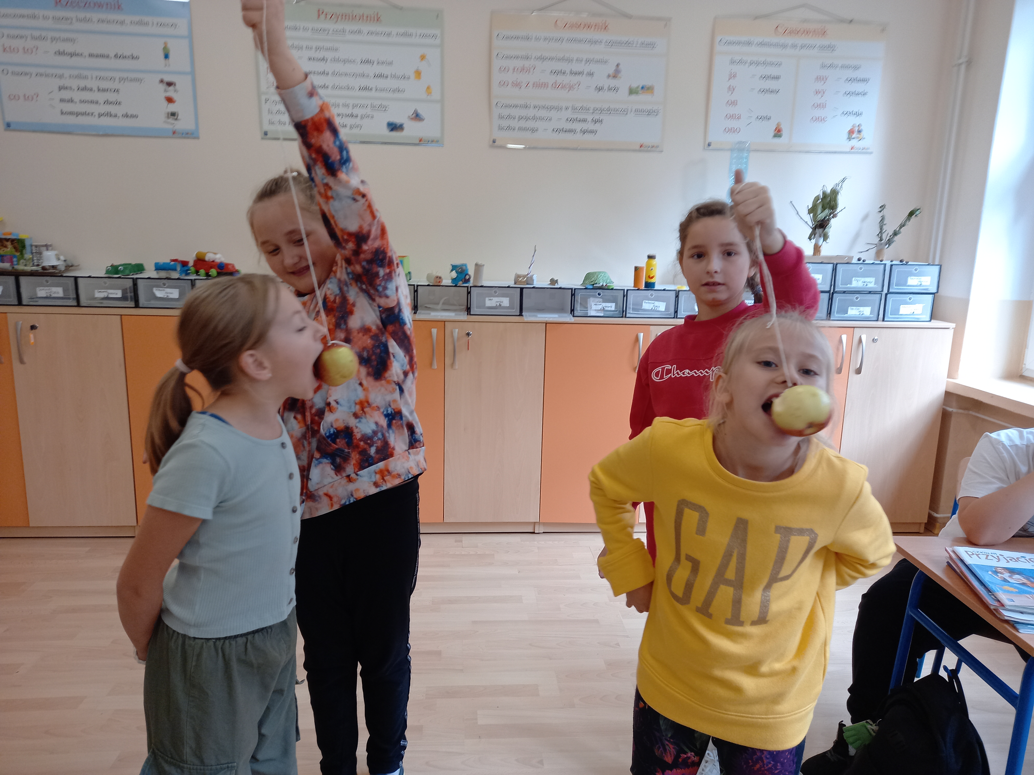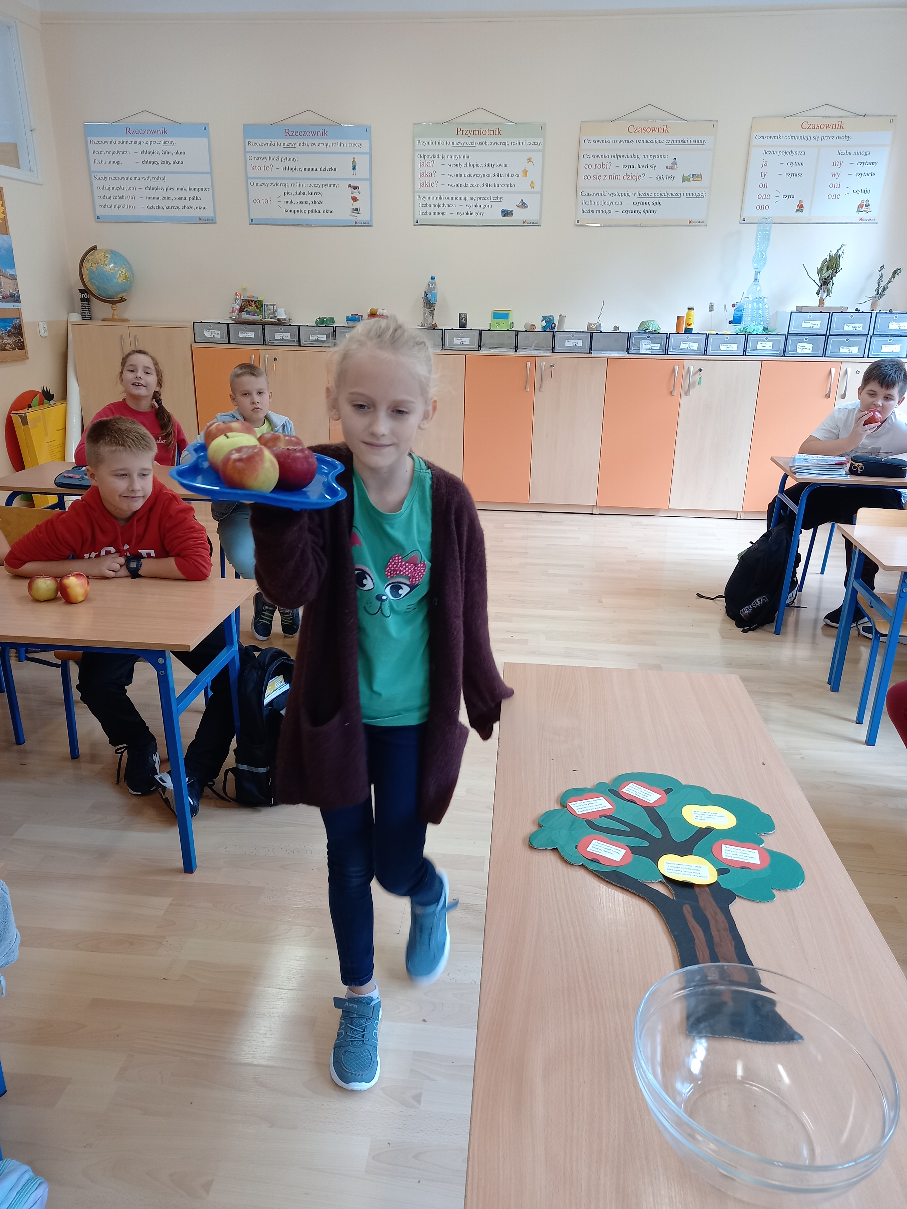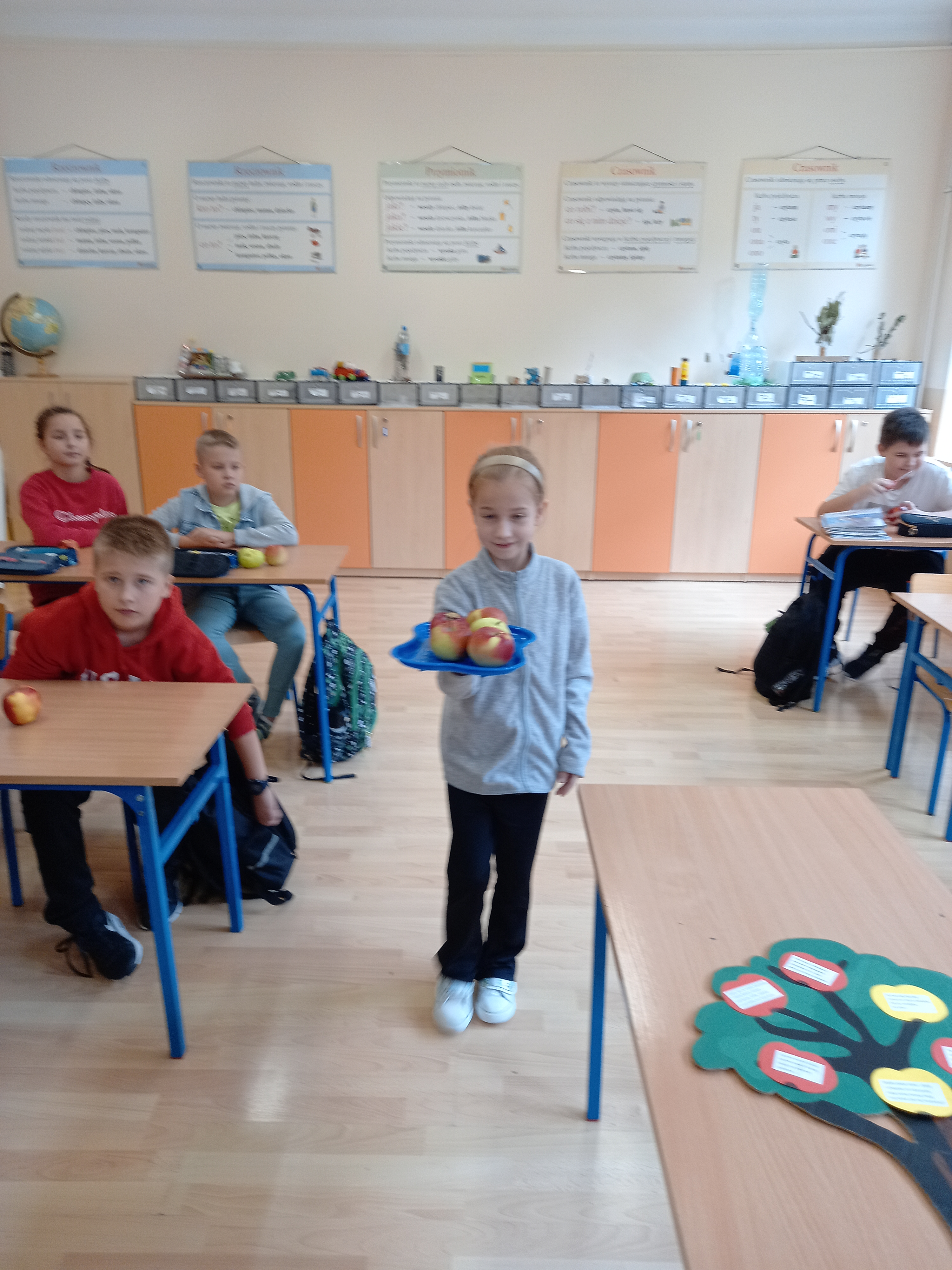 28 września obchodzimy Światowy Dzień Jabłka. Tego dnia na trzecioklasistów czekało wiele atrakcji: rozwiązywanie zagadek, zabawy zręcznościowe „Kelner”, „Zjedz jabłko”. Przy okazji uczniowie poszerzali swoją wiedzę o jabłkach. Na zakończenie dzieci wysłuchały utwór J. Brzechwy pt. „Entliczek-pentliczek”, po czym zamieniły się w „robaczki” i pozowały do zdjęć jabłku. Wszyscy wykazali się dużym poczuciem humoru.