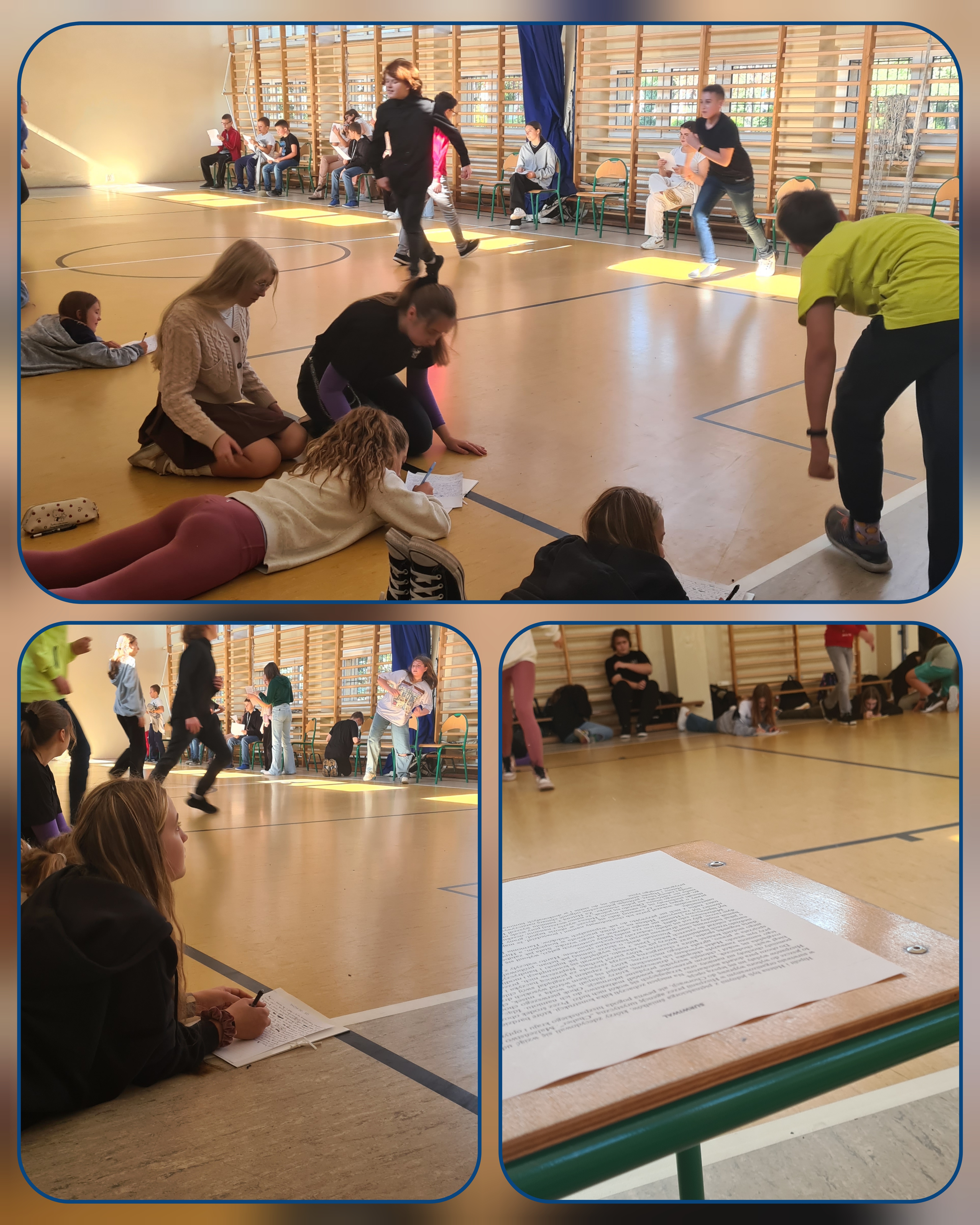 Uczniowie klas 4-8, oprócz zorganizowanej w tym dniu „Przerwy na czytanie”, wzięli udział w konkursie nazwanym „Dyktando biegane”. Zadaniem uczniów było zapisanie na kartce naszpikowanego trudnościami tekstu, który każdy zespół miał umieszczony po drugiej stronie sali gimnastycznej. Uczniowie na zmianę podbiegali do tekstu, zapamiętywali go, a następnie podbiegali do swoich drużyn i starali się wiernie przekazać jego treść pozostałym kolegom. Wśród reprezentantów drużyn byli uczniowie z dysleksją i trudnościami w nauce, co w żadnym stopniu nie przeszkodziło w realizacji naszego konkursowego zadania. Wszystkie drużyny wykazały się wspaniałą współpracą w myśl zasady, że przełamywać bariery jest łatwiej, gdy możemy liczyć na pomoc innych osób. Pozytywna rywalizacja wypełniła emocjami całą salę gimnastyczną. Każda drużyna nagrodzona została pamiątkowym dyplomem, a niebawem poznamy zwycięzców naszego konkursowego wyzwania.
