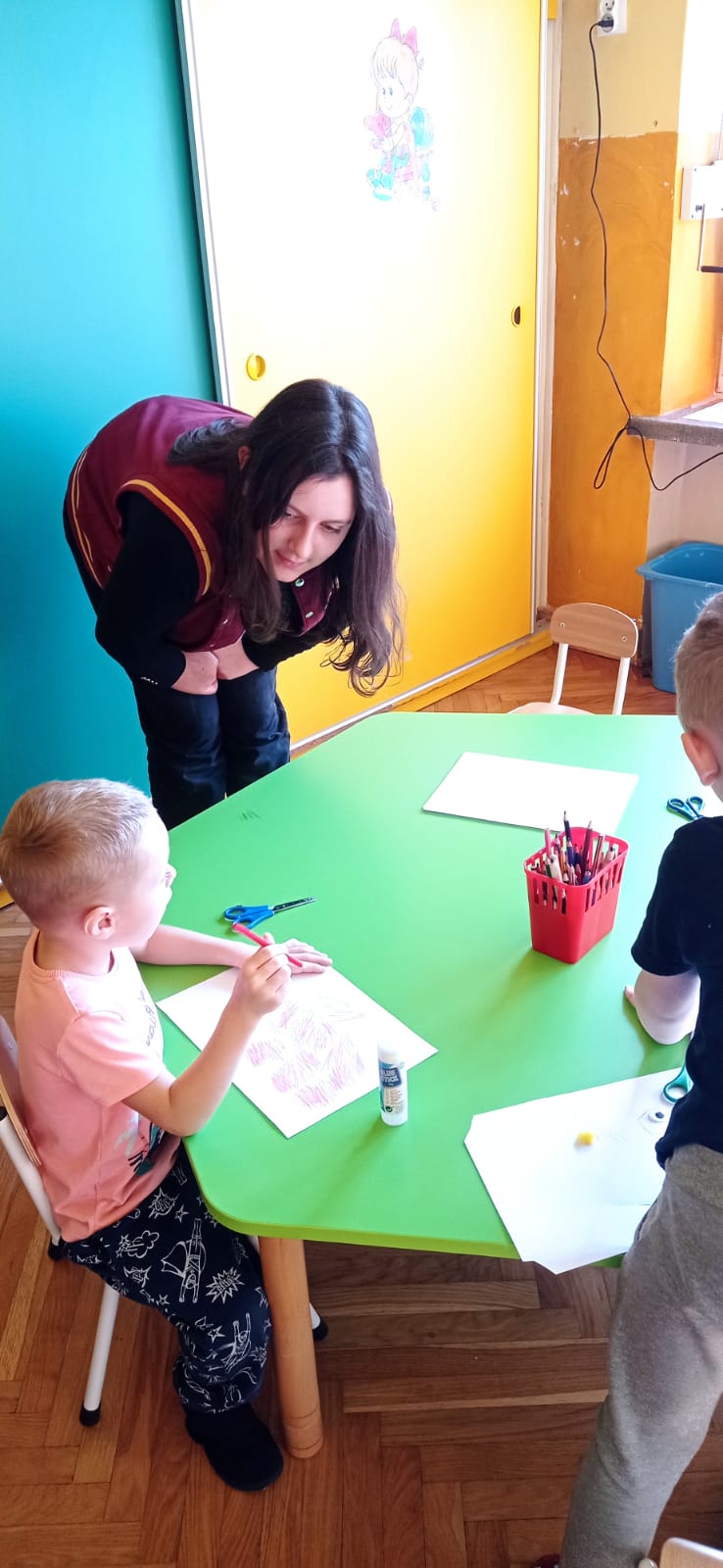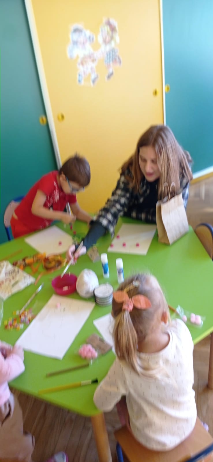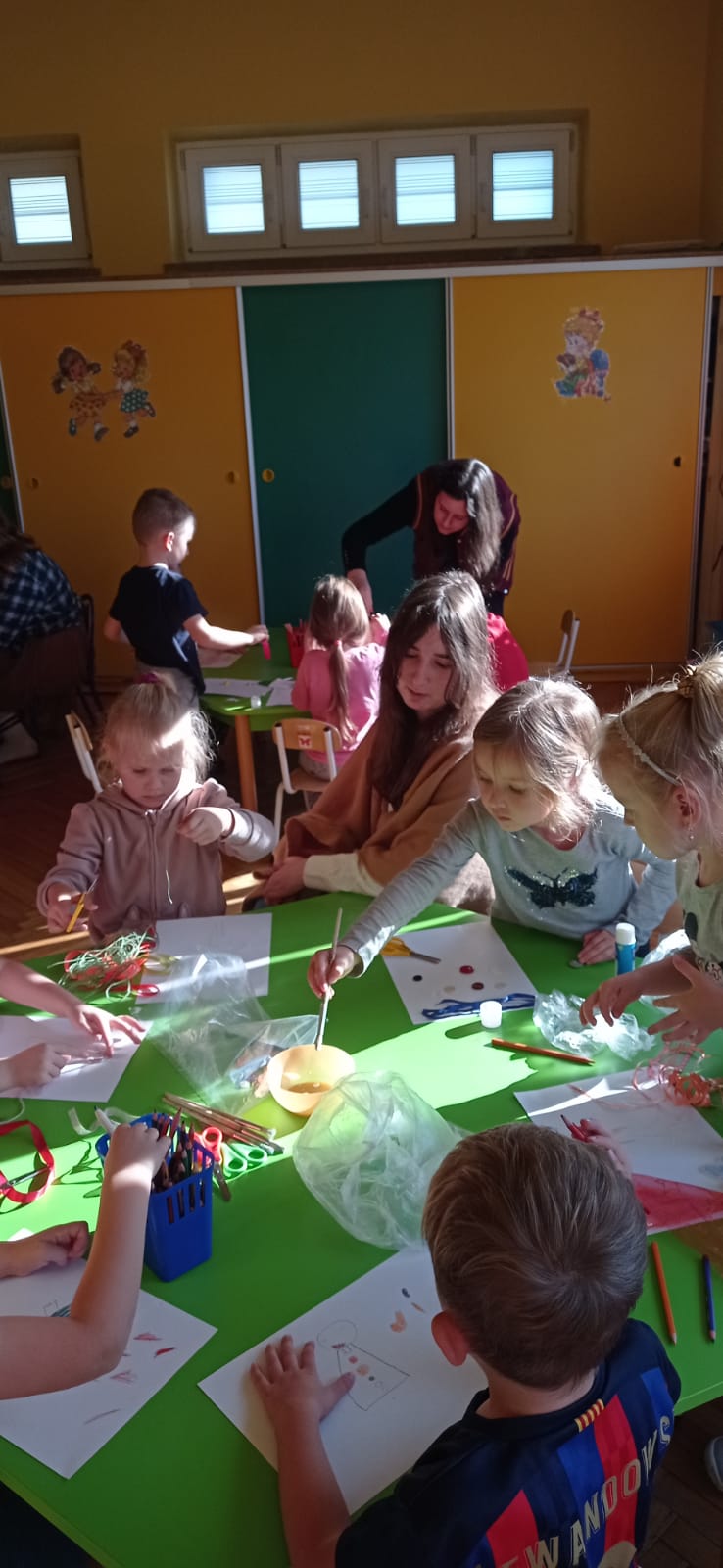 Następnie przy niewielkiej pomocy wolontariuszek i nauczycieli, dzieci wykonywały prace plastyczne ilustrujące przeczytane utwory.