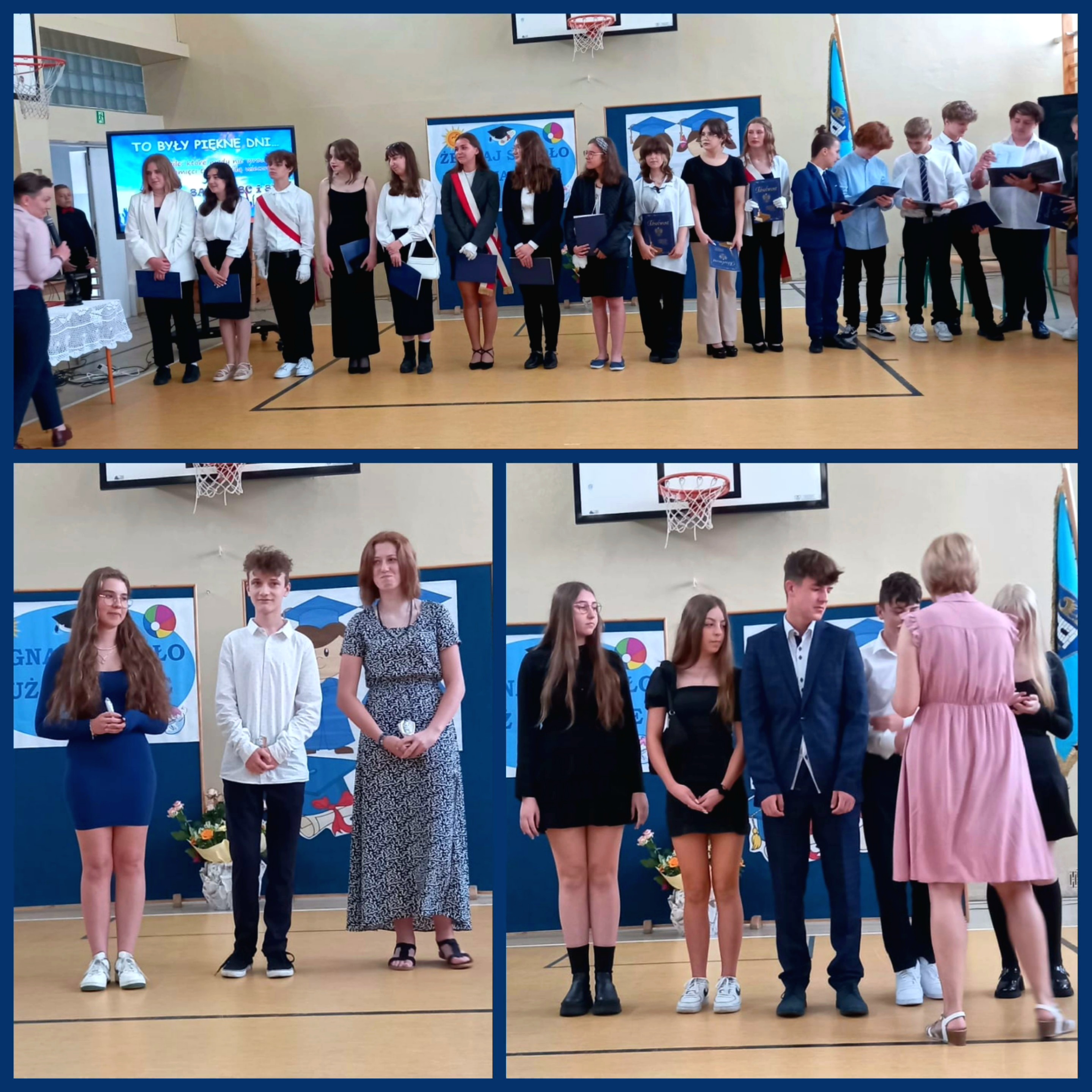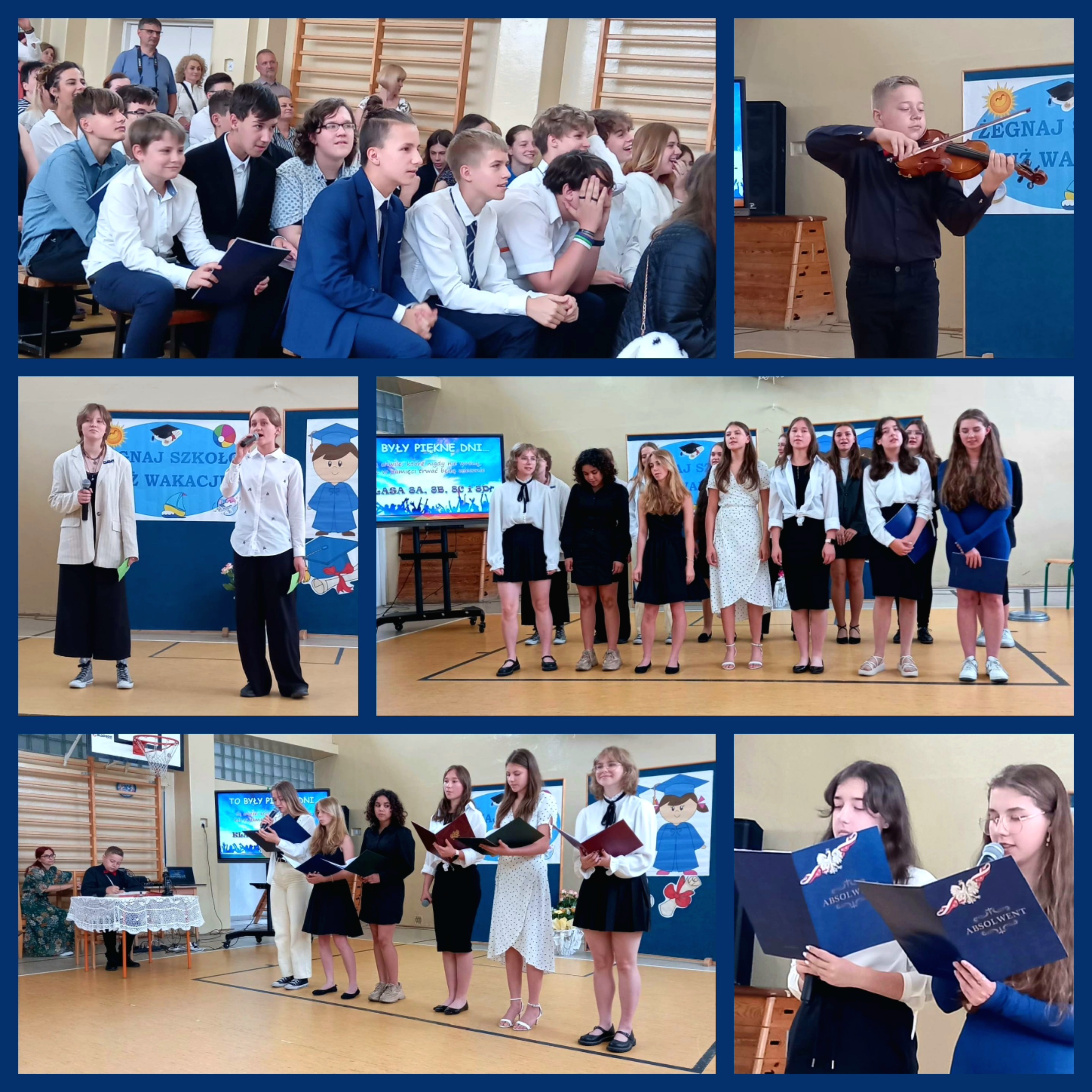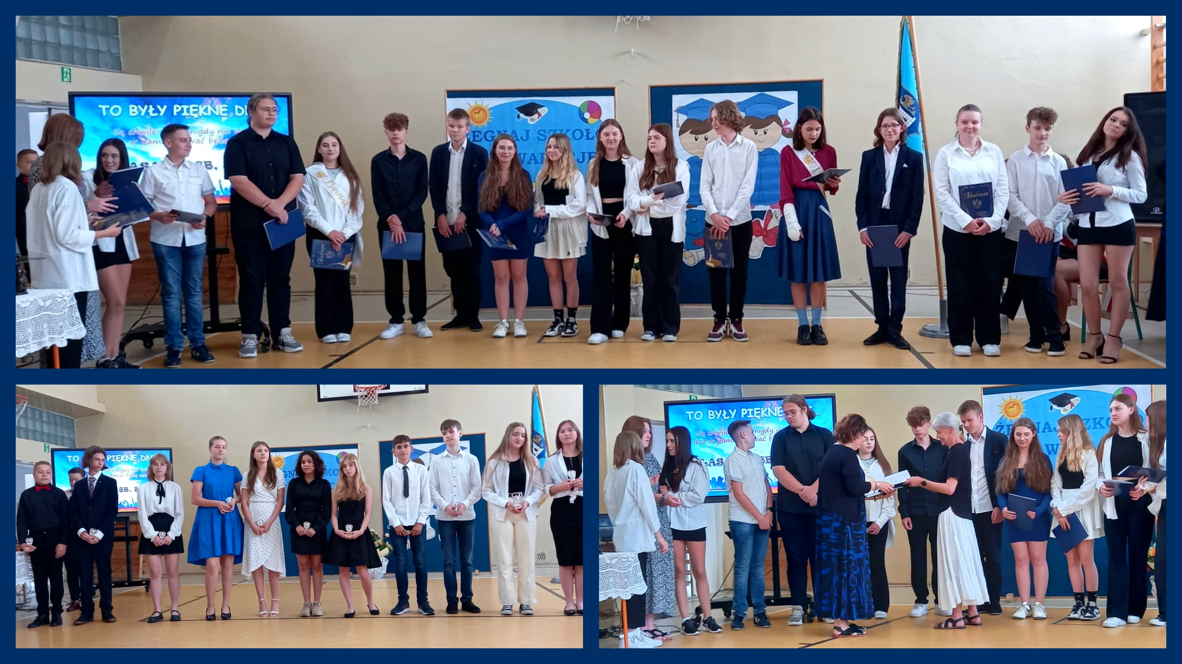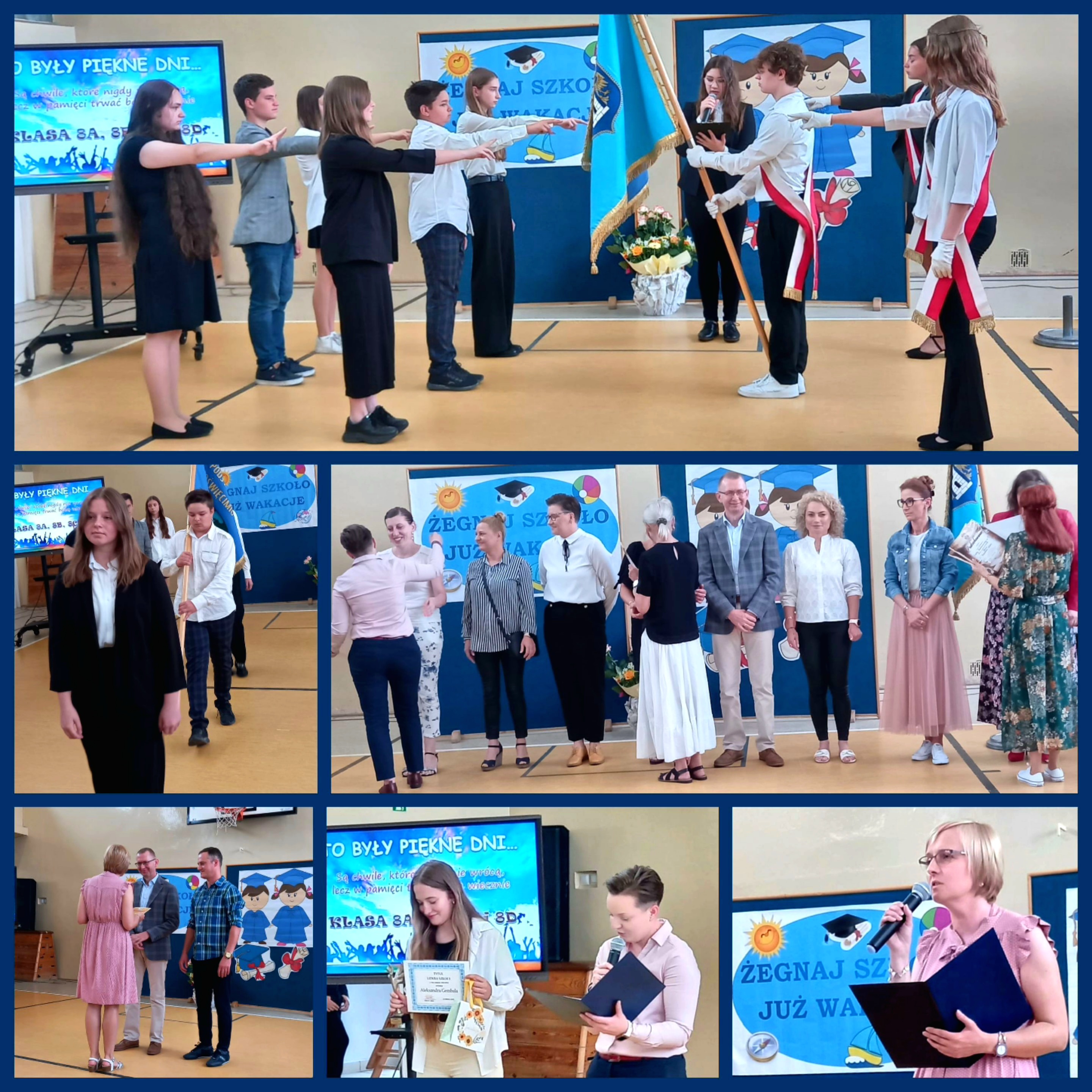 Dnia 23 czerwca uroczyście pożegnaliśmy ósmoklasistów. Każdy otrzymał teczkę absolwenta wraz ze świadectwem ukończenia szkoły. Uczniowie, którzy zdobyli świadectwo z wyróżnieniem otrzymali statuetki. Ważnym momentem było ogłoszenie Lidera Szkoły roku szkolnego 2022/23. Została nim uczennica klasy 8d Aleksandra Gembala. Nie zabrakło także podziękowań dla Dyrekcji, wychowawców, nauczycieli, przedstawicieli Rady Rodziców oraz rodziców absolwentów. Na zakończenie czekała na ósmoklasistów miła niespodzianka. Wspólnie mogliśmy powspominać ostatnie 8 lat.