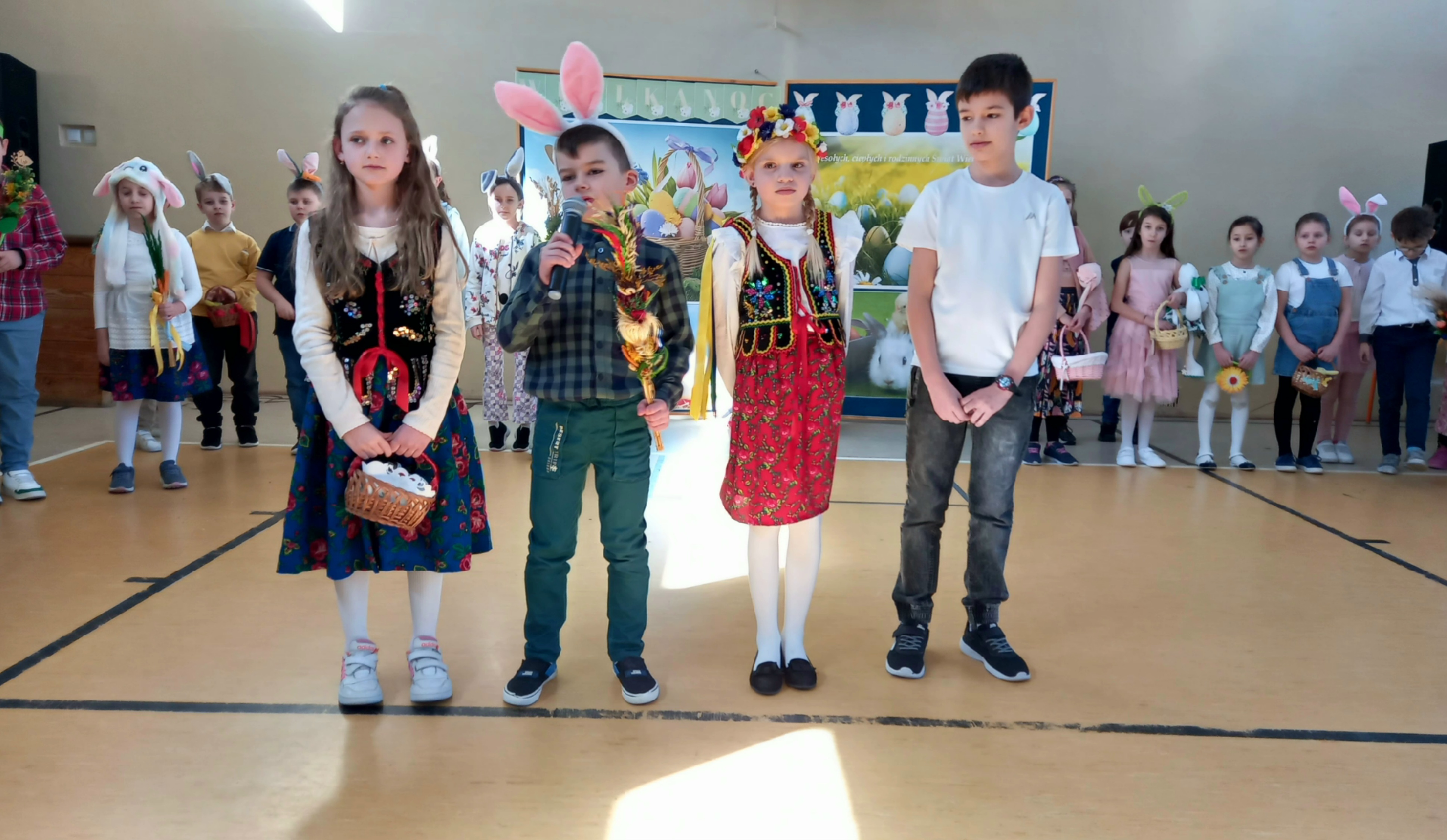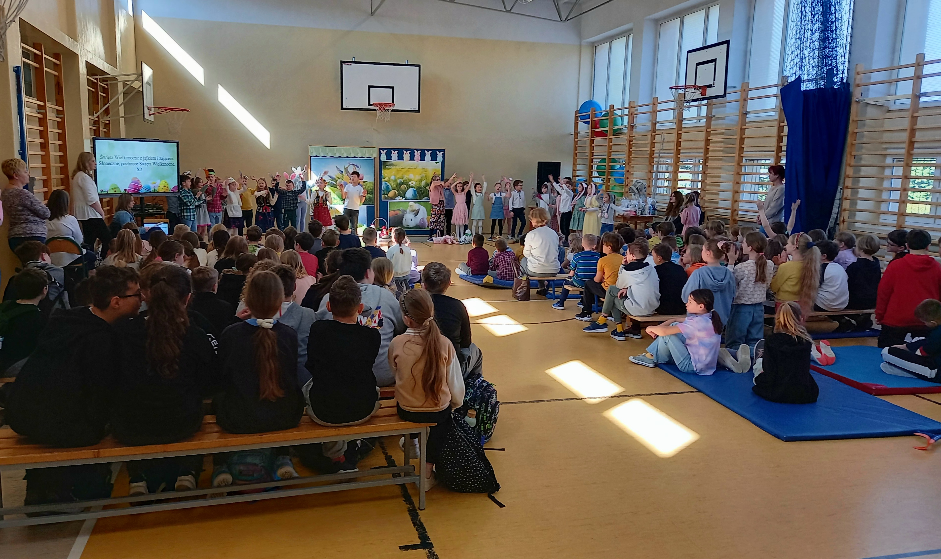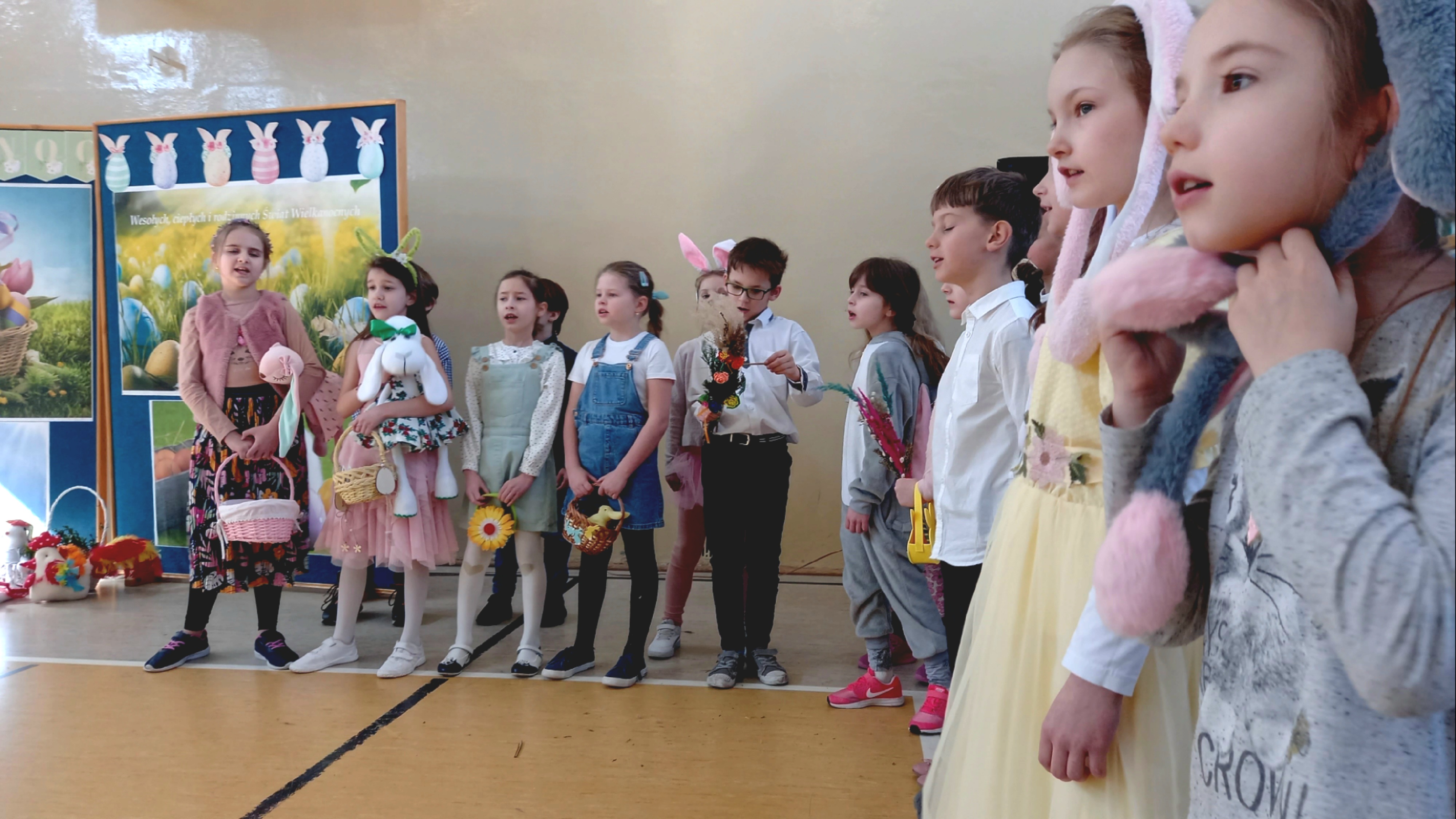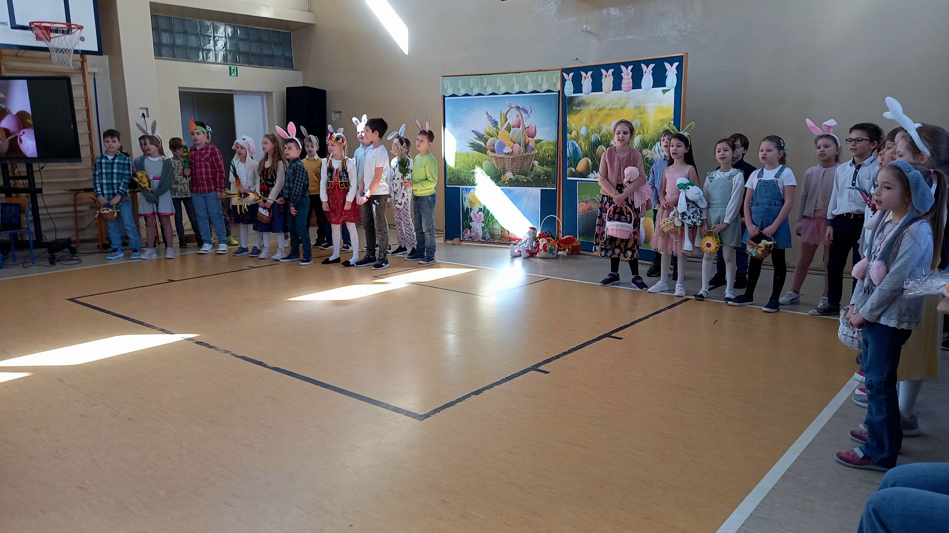 W dniu 26 marca, w naszej szkole, klasy drugie zaprezentowały się w krótkim przedstawieniu przygotowanym z okazji nadchodzących Świąt Wielkanocnych. Na scenie pojawiły się wesołe króliczki, rozkoszne baranki oraz urocze kurczątka. Dzieci były także przebrane w tradycyjne stroje krakowskie. Scenerię dopełniły takie rekwizyty jak koszyczki i palmy a na tablicy multimedialnejpojawiły się teledyski do śpiewanych piosenek. Sala gimnastyczna tętniła kolorami! Drugoklasiści przedstawili tradycje związane z Wielkanocą, począwszy od Niedzieli Palmowej po Lany Poniedziałek. Pięknie recytowane wiersze oraz wesoło odśpiewane piosenki wprowadziły nas w klimat zbliżających się Świąt.