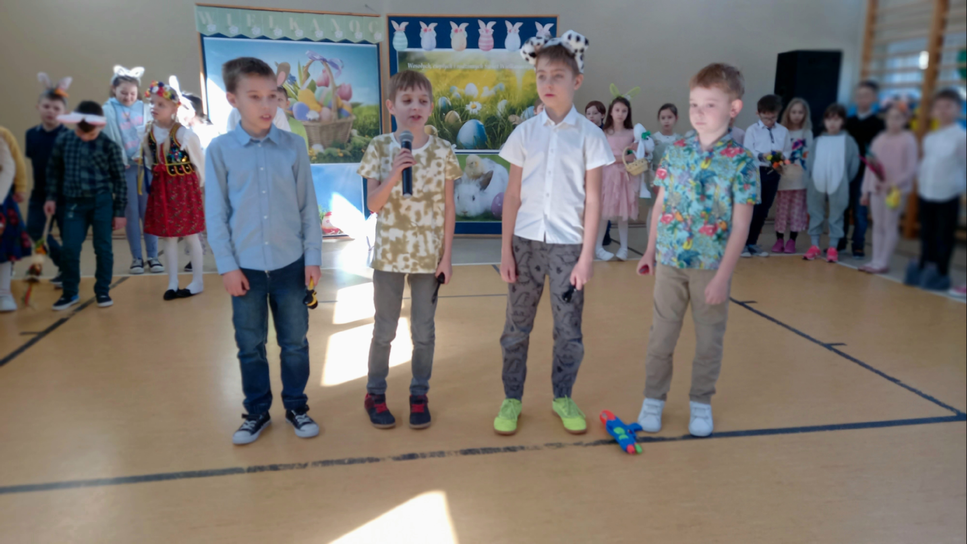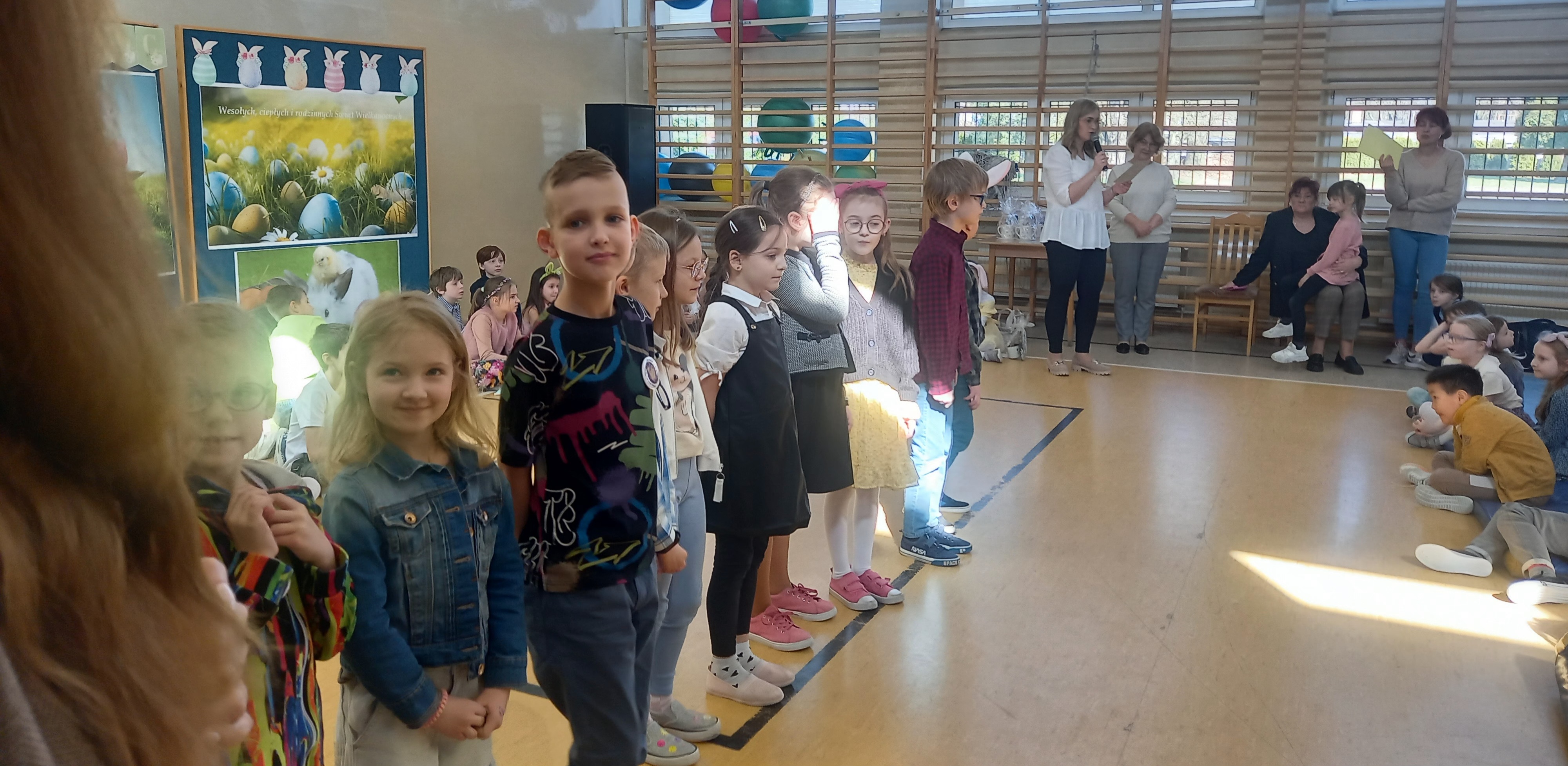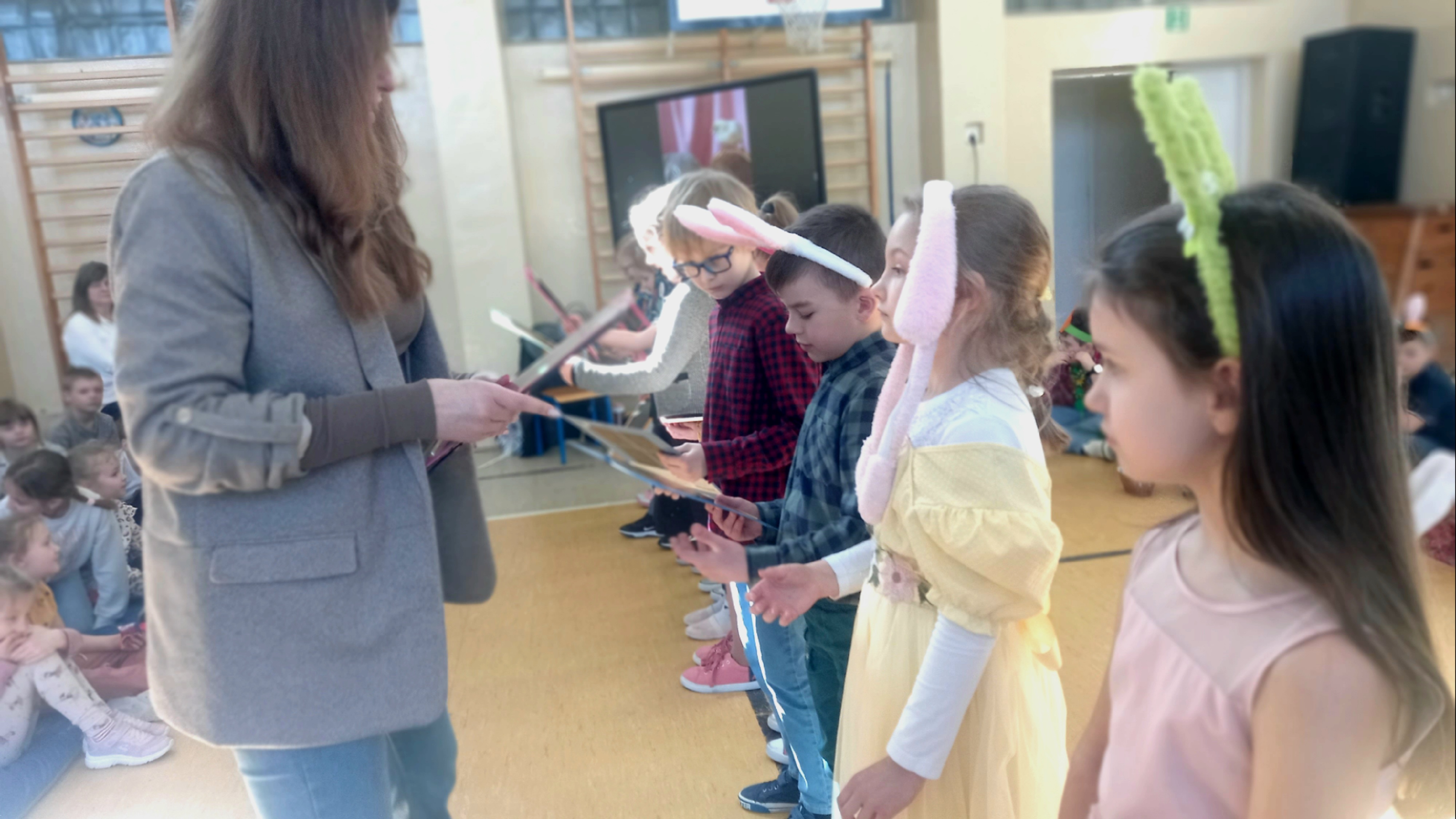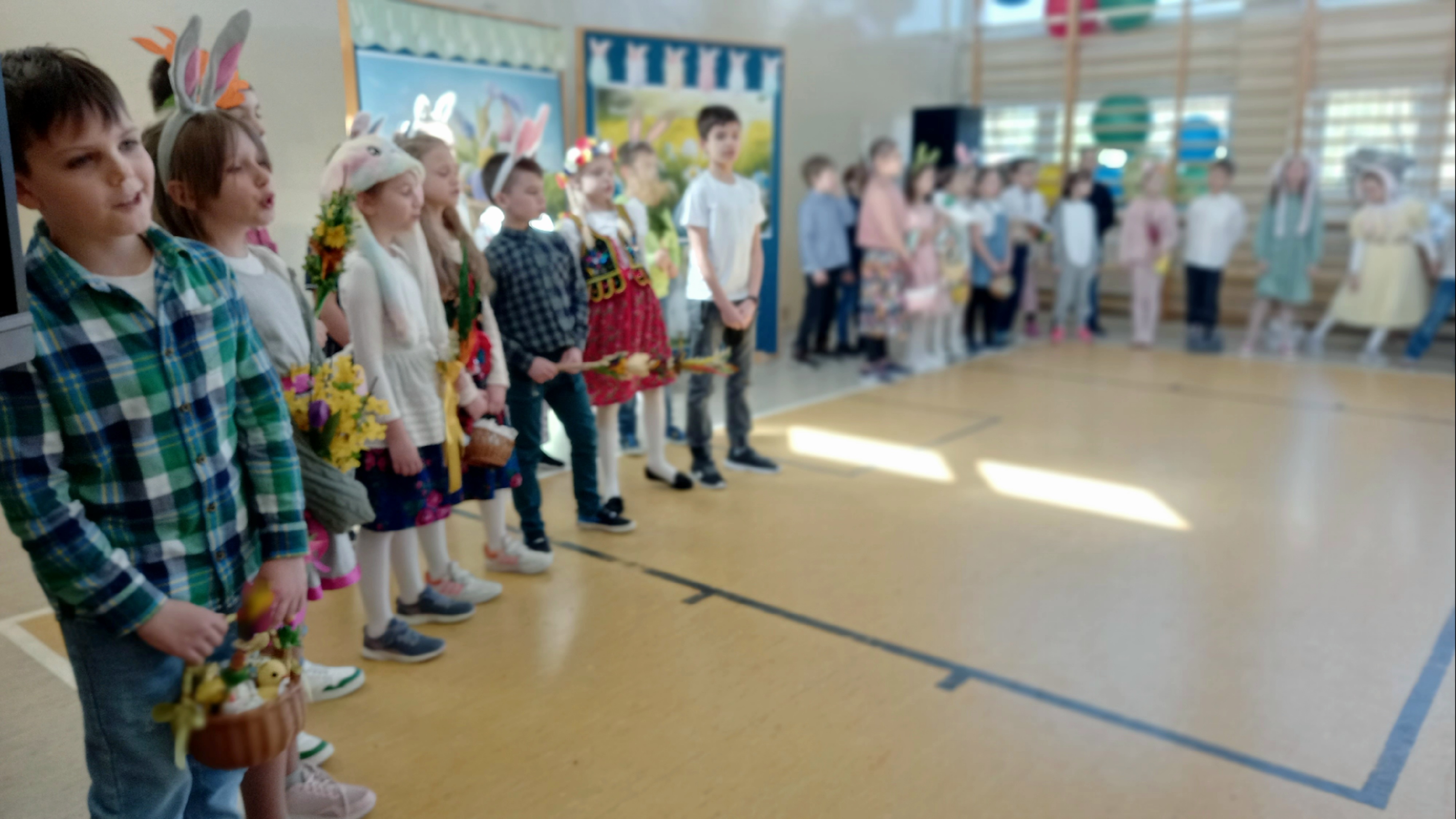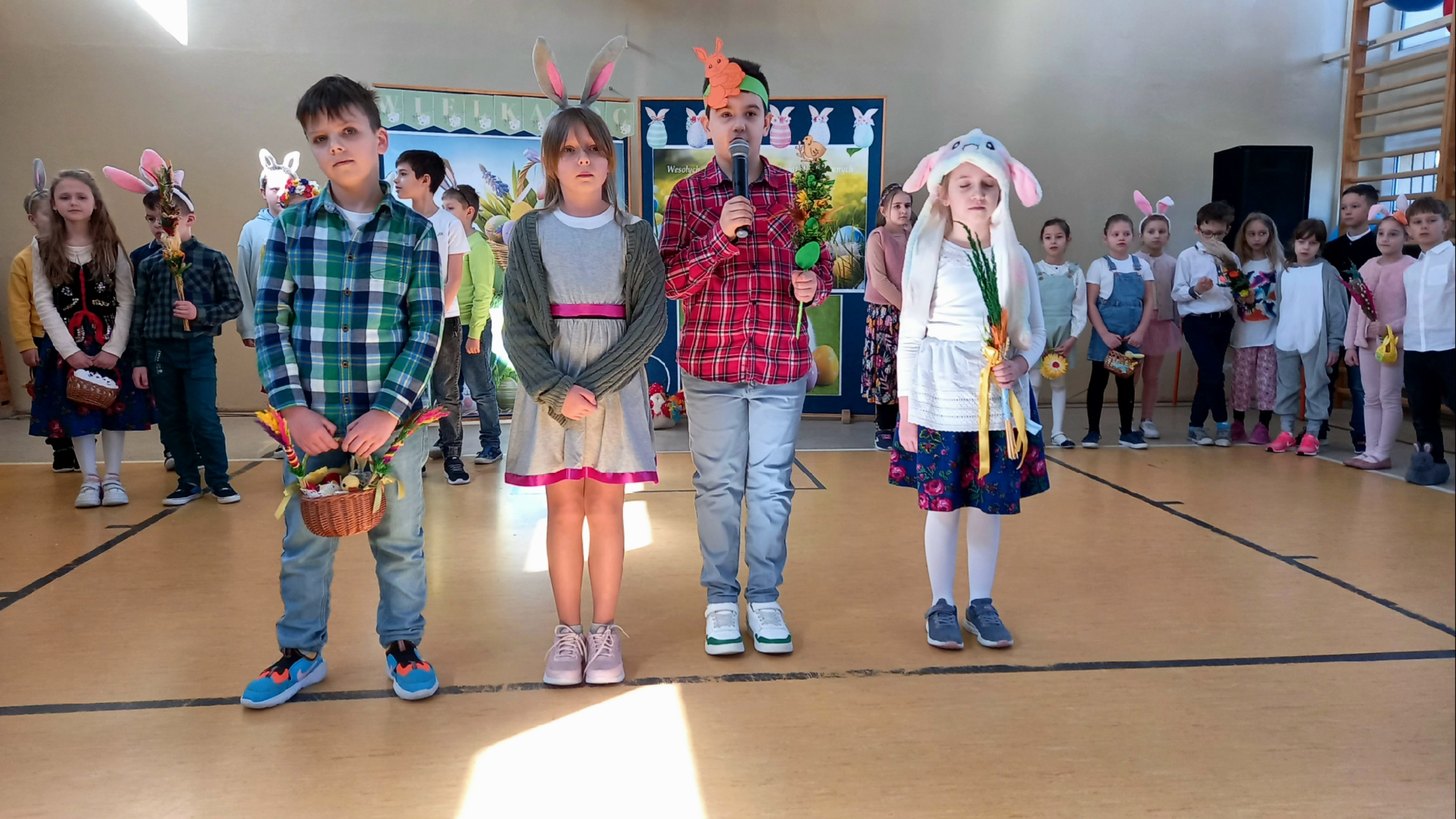 W dniu 26 marca, w naszej szkole, klasy drugie zaprezentowały się w krótkim przedstawieniu przygotowanym z okazji nadchodzących Świąt Wielkanocnych. Na scenie pojawiły się wesołe króliczki, rozkoszne baranki oraz urocze kurczątka. Dzieci były także przebrane w tradycyjne stroje krakowskie. Scenerię dopełniły takie rekwizyty jak koszyczki i palmy a na tablicy multimedialnejpojawiły się teledyski do śpiewanych piosenek. Sala gimnastyczna tętniła kolorami! Drugoklasiści przedstawili tradycje związane z Wielkanocą, począwszy od Niedzieli Palmowej po Lany Poniedziałek. Pięknie recytowane wiersze oraz wesoło odśpiewane piosenki wprowadziły nas w klimat zbliżających się Świąt.