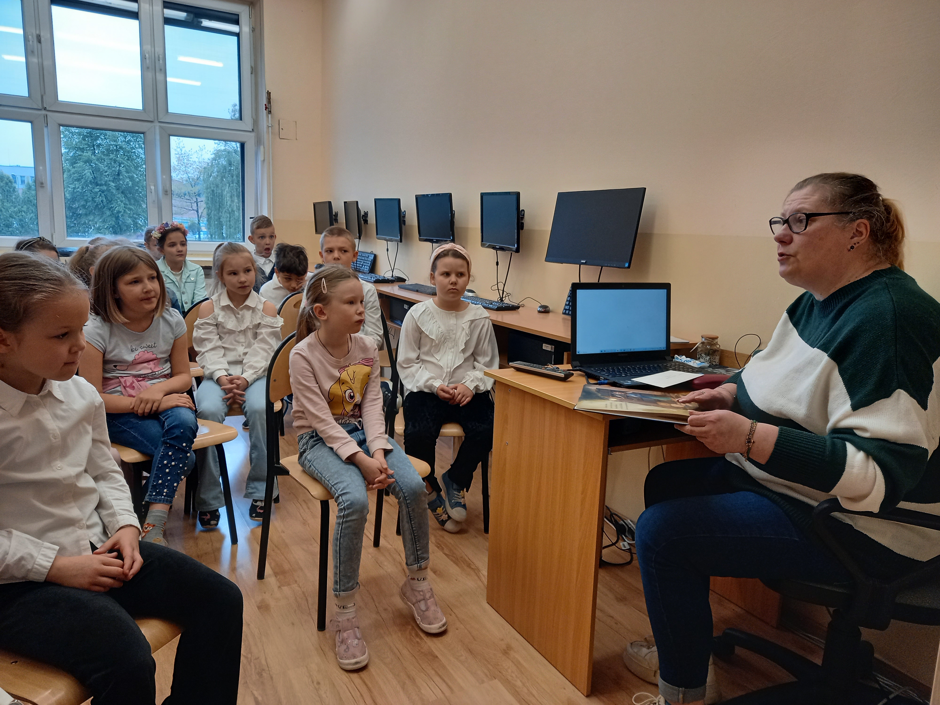 Zanim jednak zostali pasowani na czytelników wysłuchali poetyckiego picturebooka autorstwa Iwony Pietrzak – Płachty ( nauczycielki roku 2022r.) – opowieści o mocy, która drzemie w czytaniu. Odpowiadali też i zadawali pytania dotyczące biblioteki i książek.