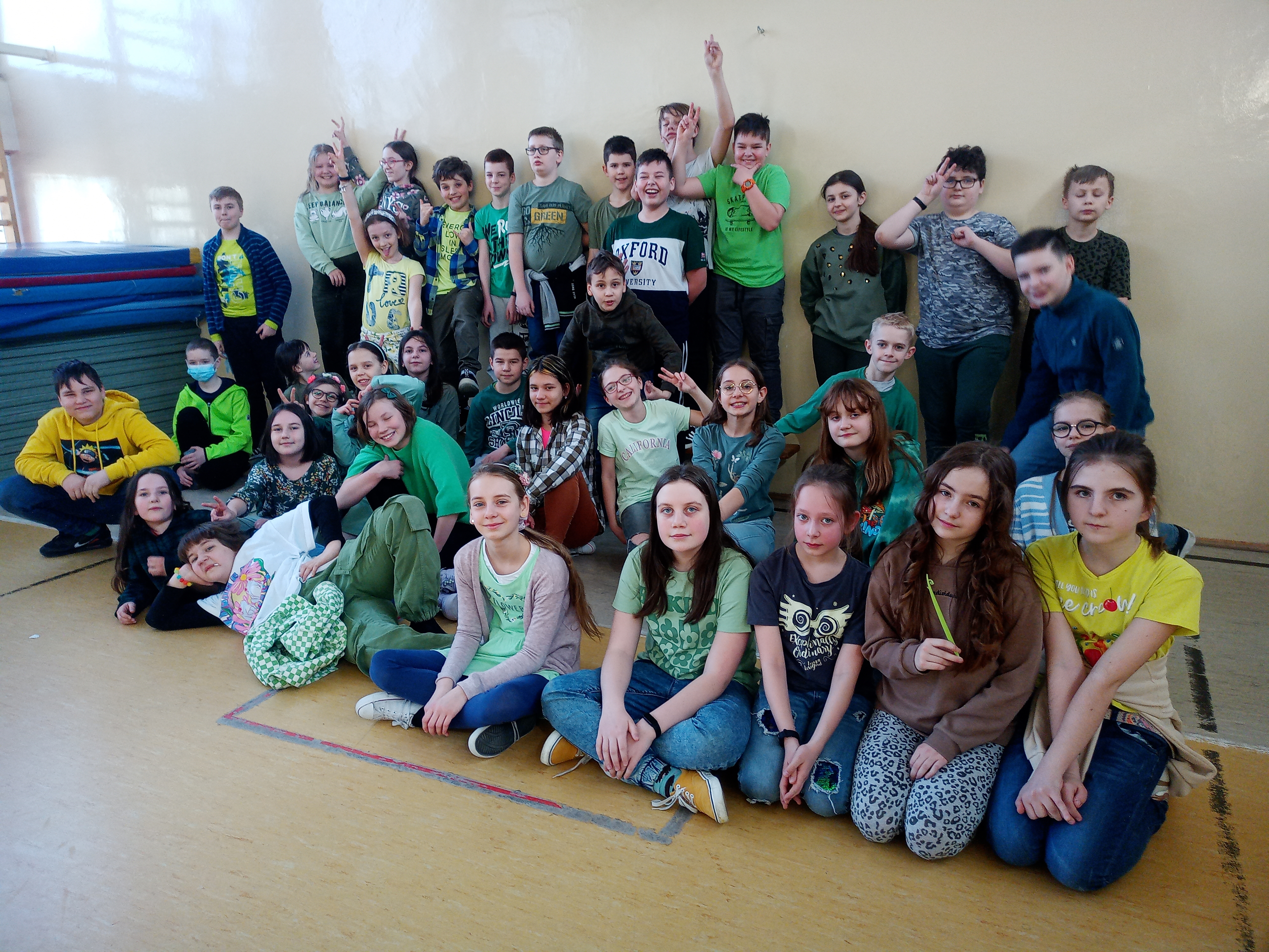 Pierwszego dnia wiosny uczniowie naszej szkoły bawili się wspólnie przy radosnych zabawach i tańcach integracyjnych. Cała brać uczniowska była ubrana na cześć nadchodzącej nowej pory roku na zielono.