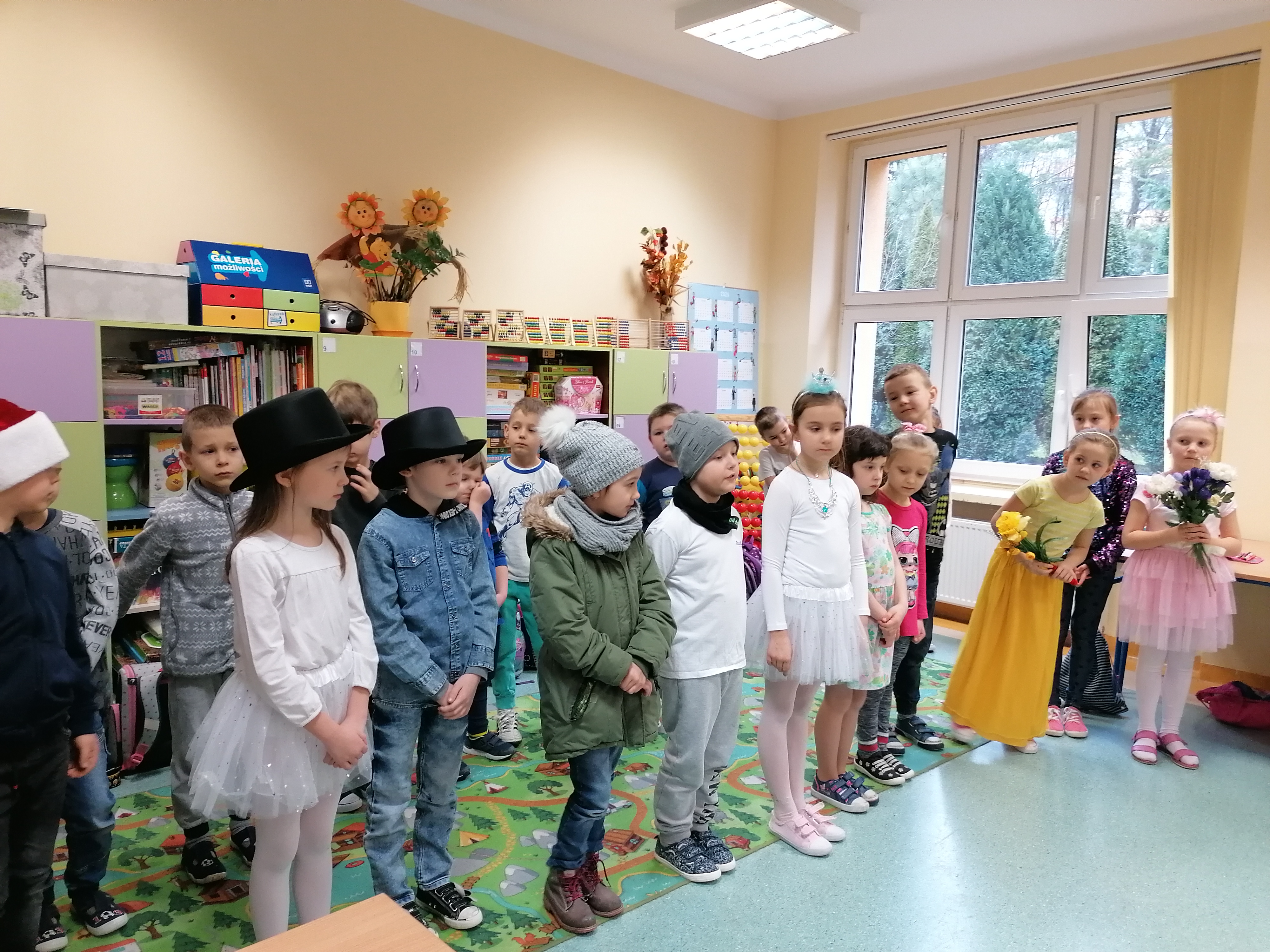 Dzieciaczki zostały powitane przez uczniów klasy Ia wraz z wychowawcą. Następnie przedszkolaki z ogromnym zainteresowaniem obejrzały scenkę teatralną pt. „Rok na karuzeli” przygotowaną przez pierwszoklasistów. Dzieci miały okazję aktywnie uczestniczyć w zajęciach, na których odpowiadały na pytania oraz rozwiązywały zagadki. Naszym gościom najbardziej podobała się projekcja multimedialna układu tanecznego do znanej piosenki. Dodatkową atrakcją dla przedszkolaków było uczestnictwo w zajęciach plastyczno – technicznych, w trakcie których wspólnie z uczniami klasy Ia wykonały pocztówkę z zimowymi miesiącami. Dzieci odbyły też krótki spacer po szkole zwiedzając sale lekcyjne, salę gimnastyczną, stołówkę i świetlicę szkolną. Na zakończenie wizyty przedszkolaki otrzymały słodki poczęstunek, a następnie pełne nowych wrażeń i doświadczeń powróciły do przedszkola.