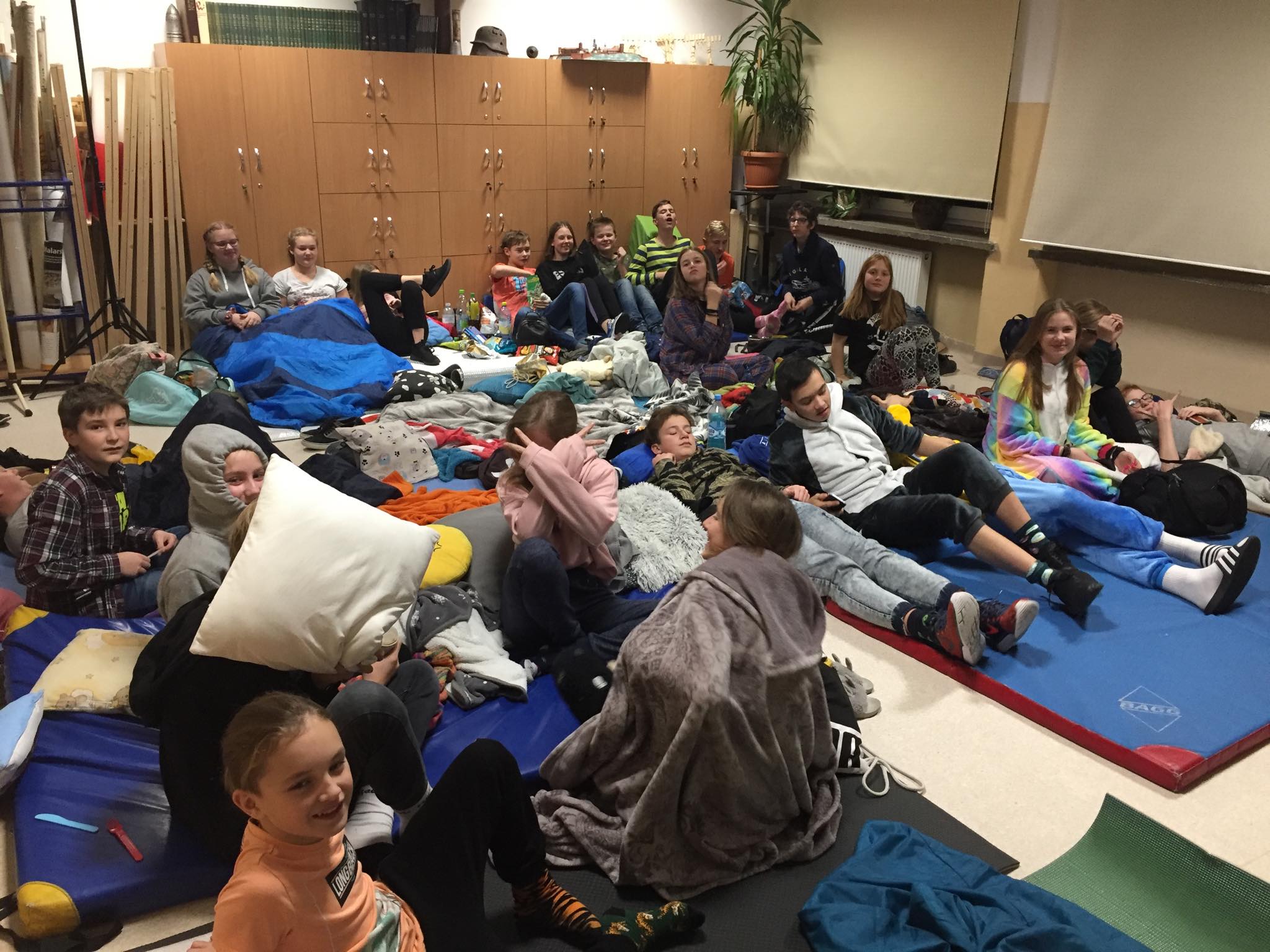 Noc z piątku na sobotę – 13/14 grudnia - chętni uczniowie klas 7 i 8 spędzili w szkole. Spotkanie zaczęło się – nie mogło być inaczej– od pizzy. Następnie było wspólne wspólne rozmowy, zabawy, zakończone losowaniem biletów do kina. Nie obyło się bez wysiłku fizycznego, czyli sprzątania sal oraz intelektualnego – znaleźli się chętni do rozwiązywania zadań z matematyki. Może będzie następny raz ...