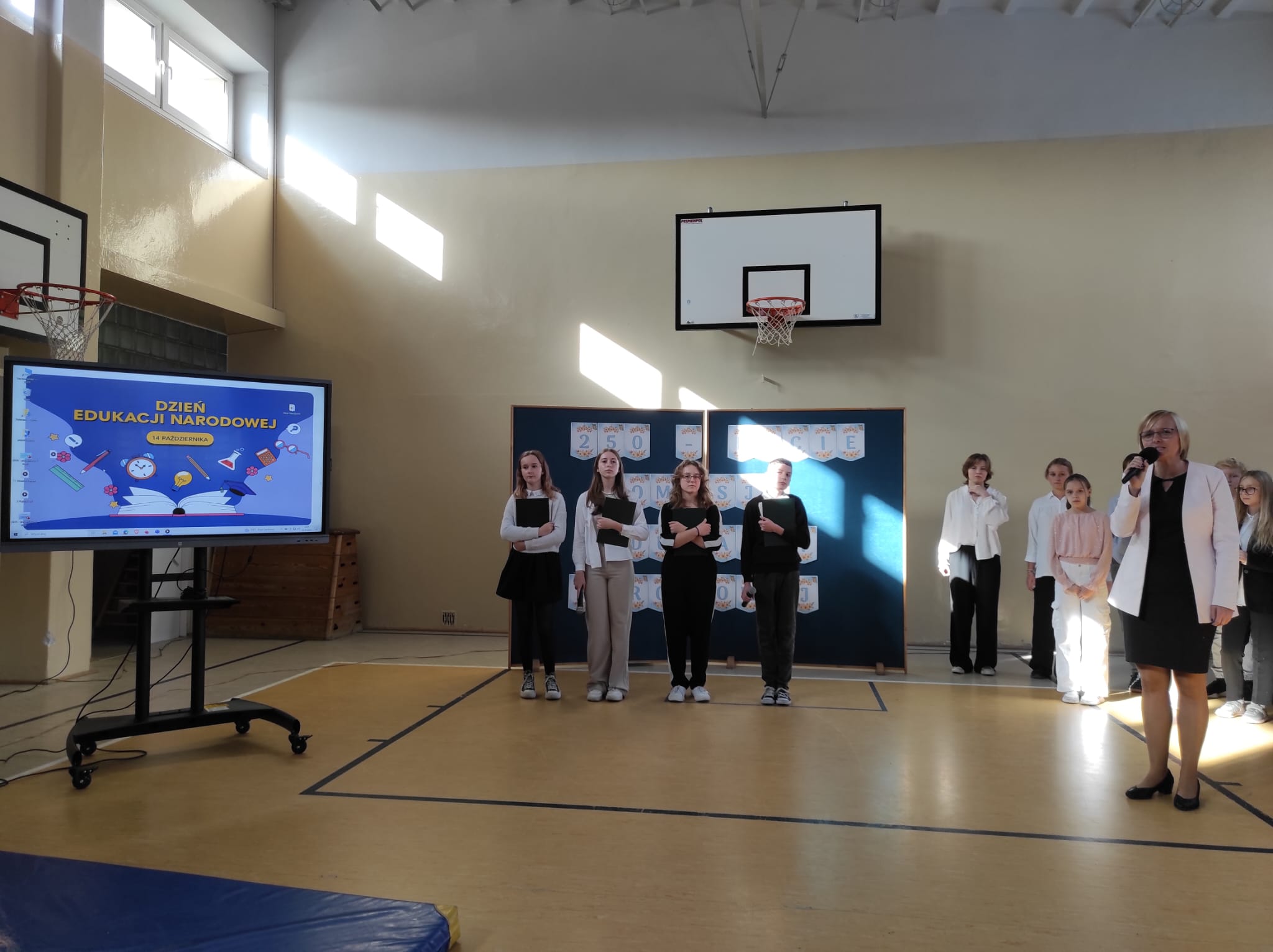 12 października społeczność szkolna spotkała się na uroczystym apelu z okazji 250 – lecia Komisji Edukacji Narodowej przygotowanym przez uczniów ze starszych klas. Apel rozpoczął się od prezentacji przedstawiającej historię utworzenia w Polsce Komisji Edukacji Narodowej. Następnie Pani Dyrektor Barbara Sandorska złożyła życzenia wszystkim pracownikom szkoły. Również reprezentacja Rady Rodziców skierowała do nauczycieli ciepłe słowa z najlepszymi życzeniami. Nie zabrakło życzeń i podziękowań od samych uczniów. Krótki artystyczny występ zakończył film, w którym w zabawny sposób uczniowie wyrazili podziękowania za gorące serce, pomocną dłoń oraz opiekę. Uroczystość przebiegała w miłej i radosnej atmosferze.